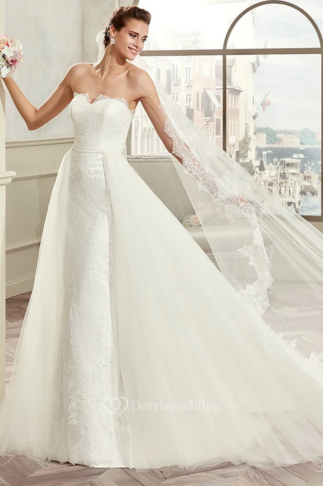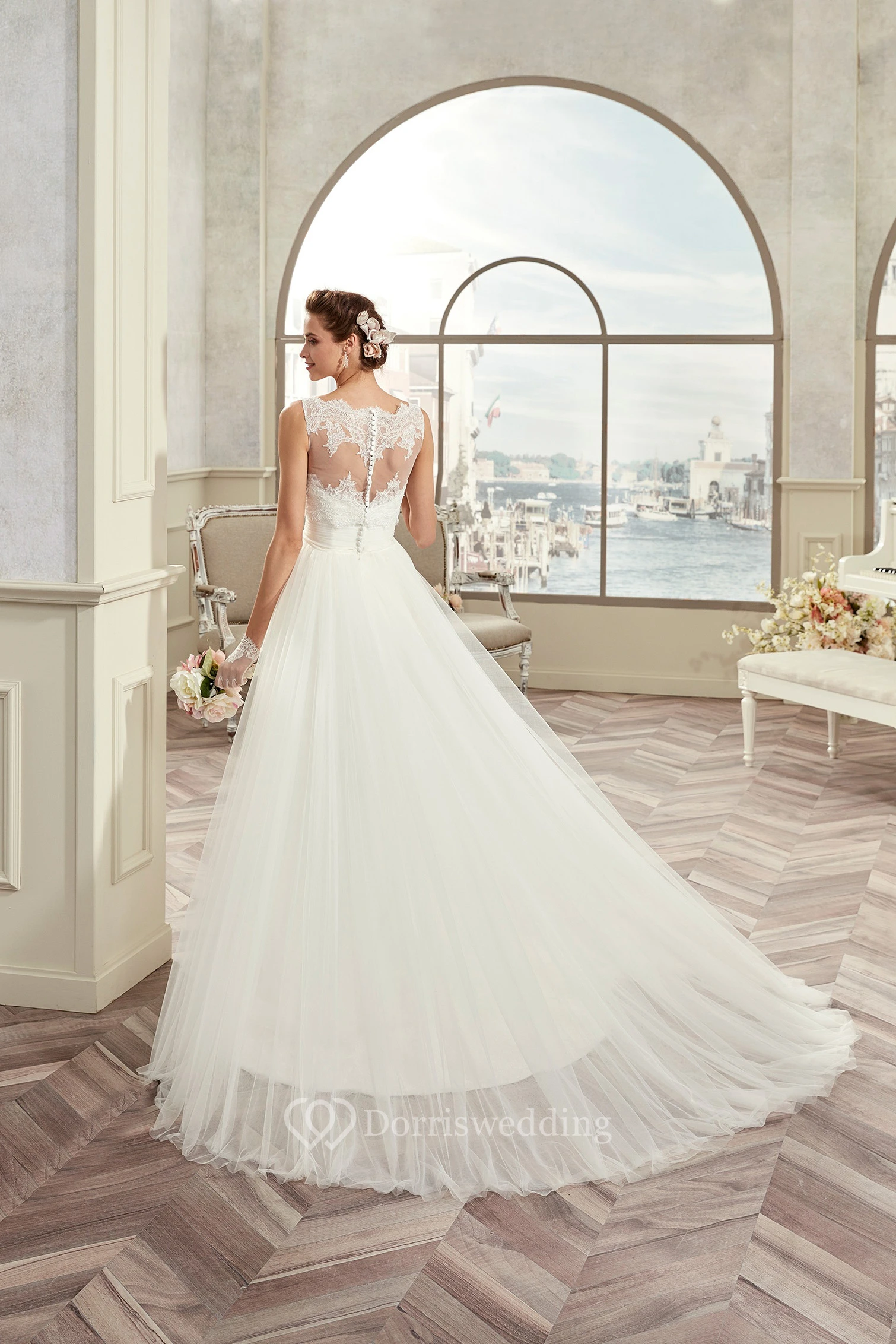 Scalloped-Neck Cap-Sleeve A-Line Bridal Gown With Illusive Design And Brush Train