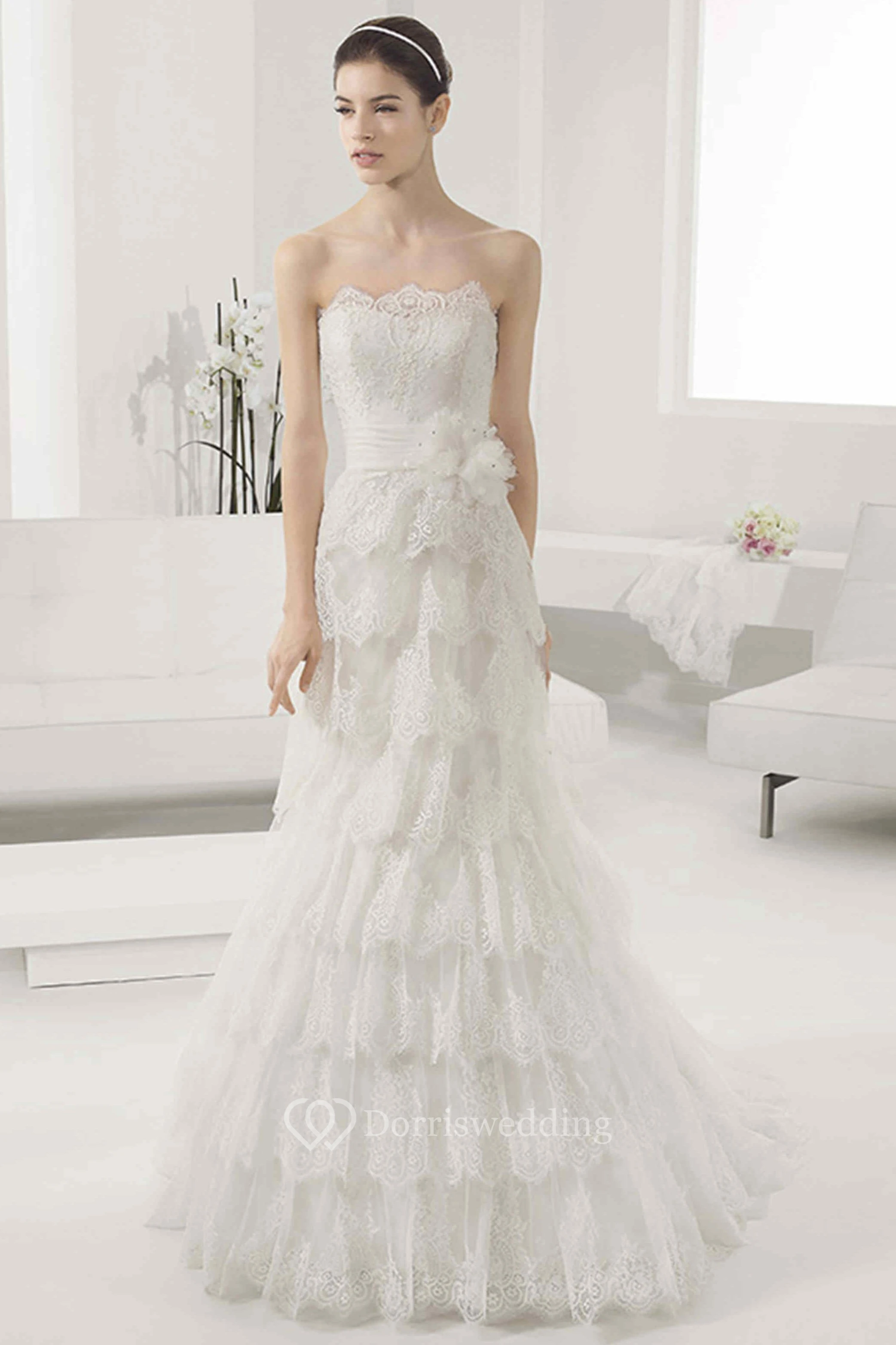Scalloped Neck Lace Ball Gown With Waist Flower And Layered Skirt