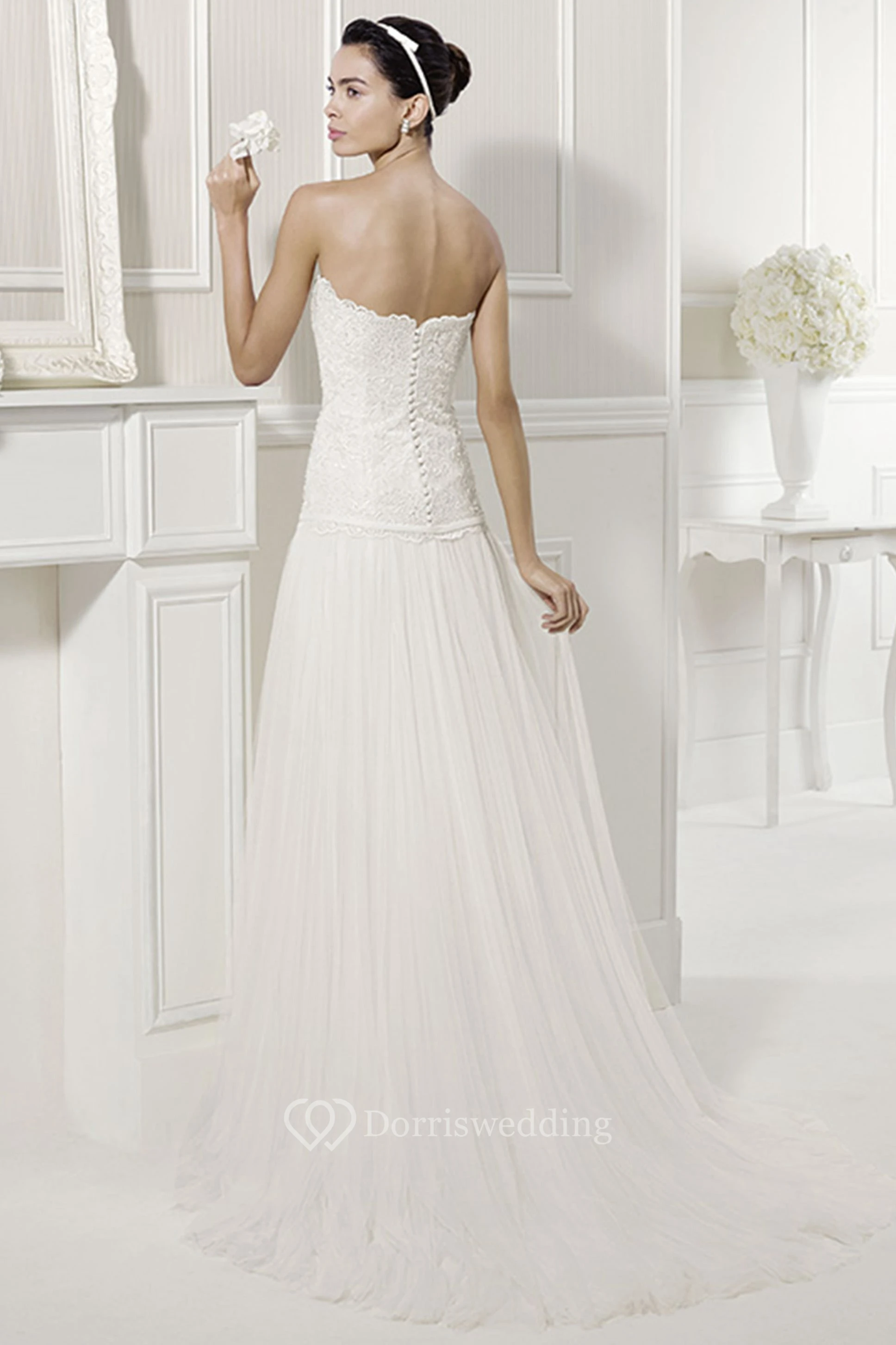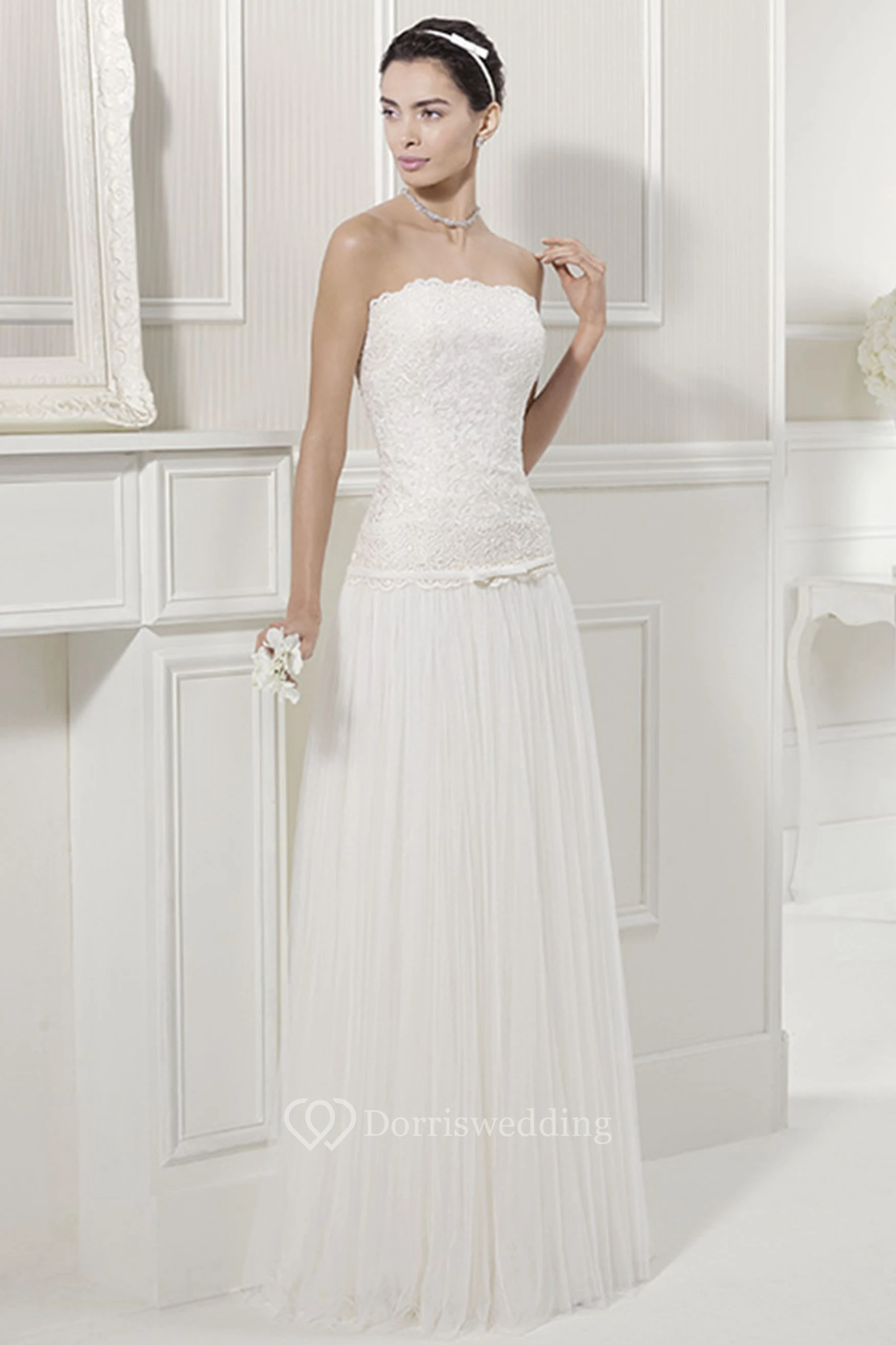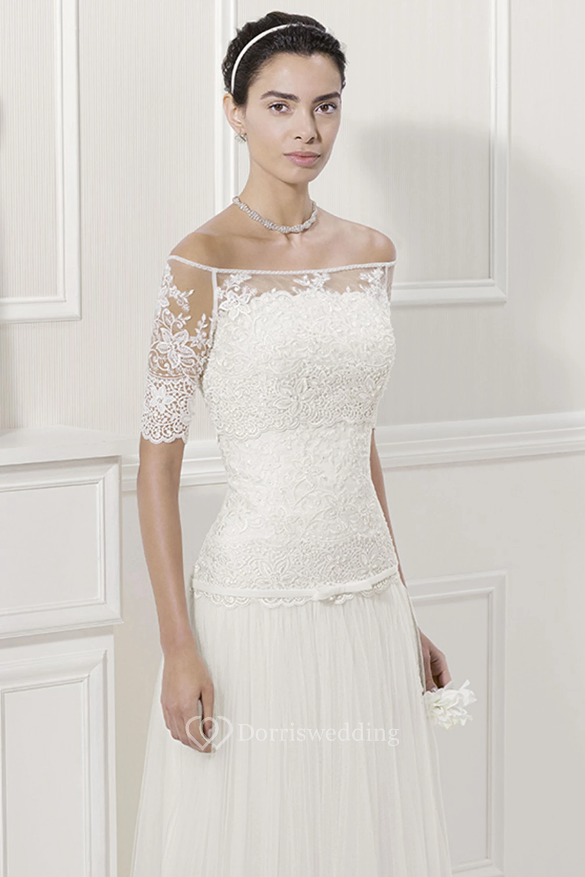 Scalloped Neck Lace Top Tulle Bridal Gown With Off-Shoulder Half Sleeves