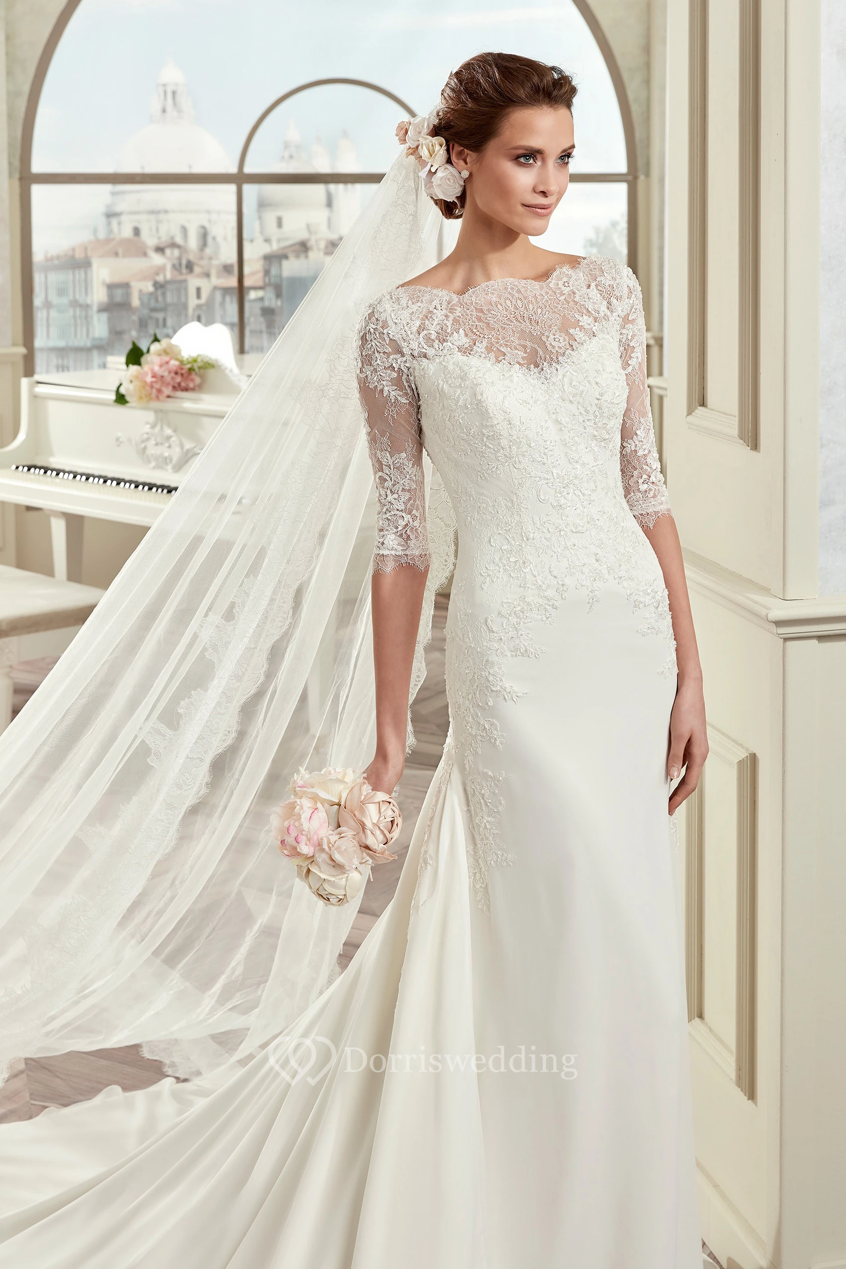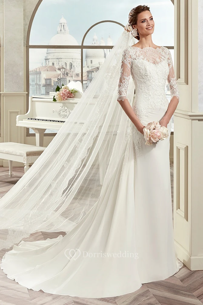 Scalloped-Neck Sheath Bridal Gown With Half-Sleeve And Court Train