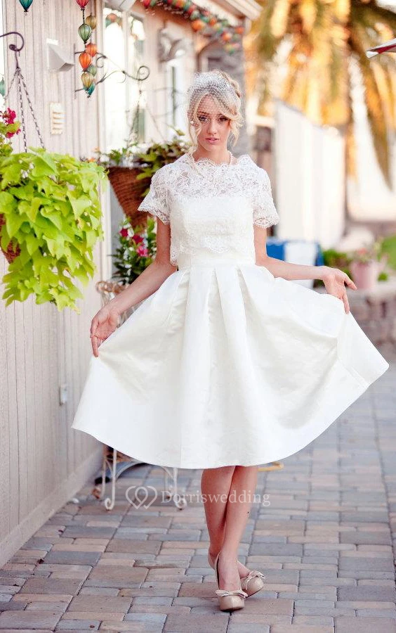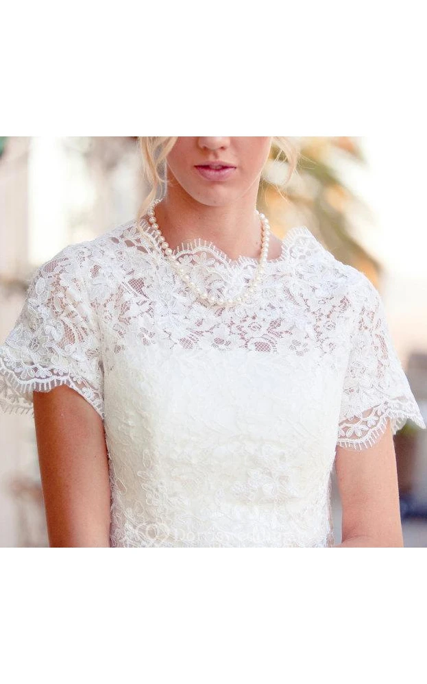 Scalloped Short Sleeve Satin Wedding Dress With Lace And Button Back