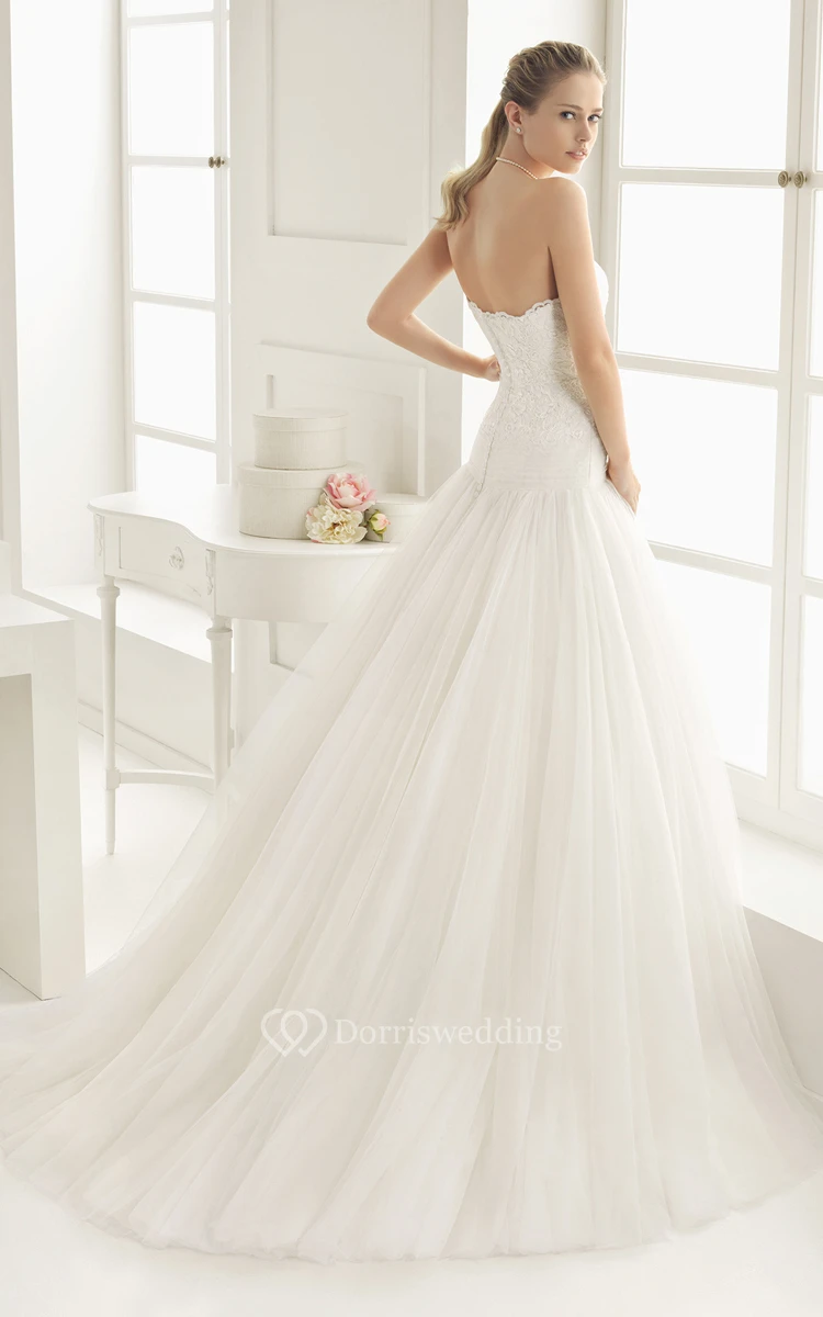 Scalloped Strapless Gown With Dropped Waistline And Flower