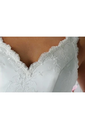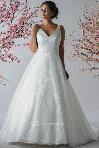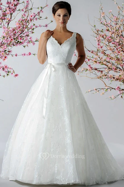 Scalloped V Neck A-Line Embroidered Tulle Bridal Gown With Sash