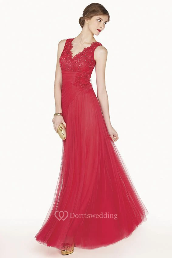 Scalloped V Neck A-Line Tulle Long Prom Dress With Empire Floral Waist