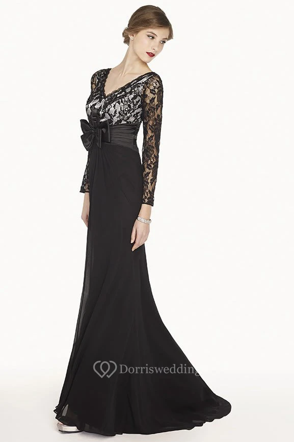 Scalloped V Neck Lace Long Prom Dress Long Prom Dress With Waist Bow