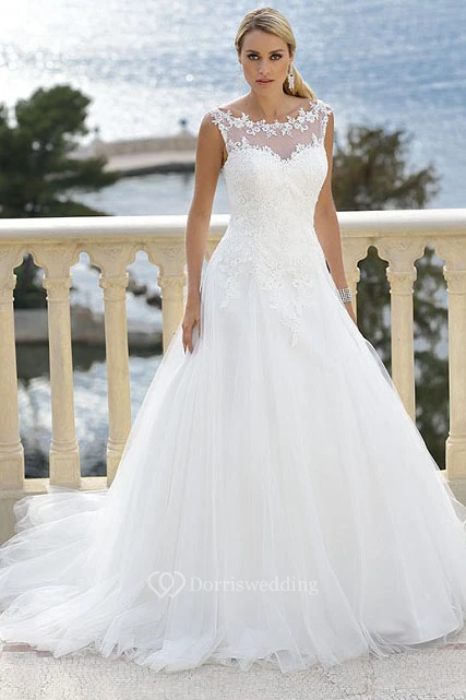 Scoop Floor-Length Appliqued Tulle Wedding Dress With Court Train And Illusion