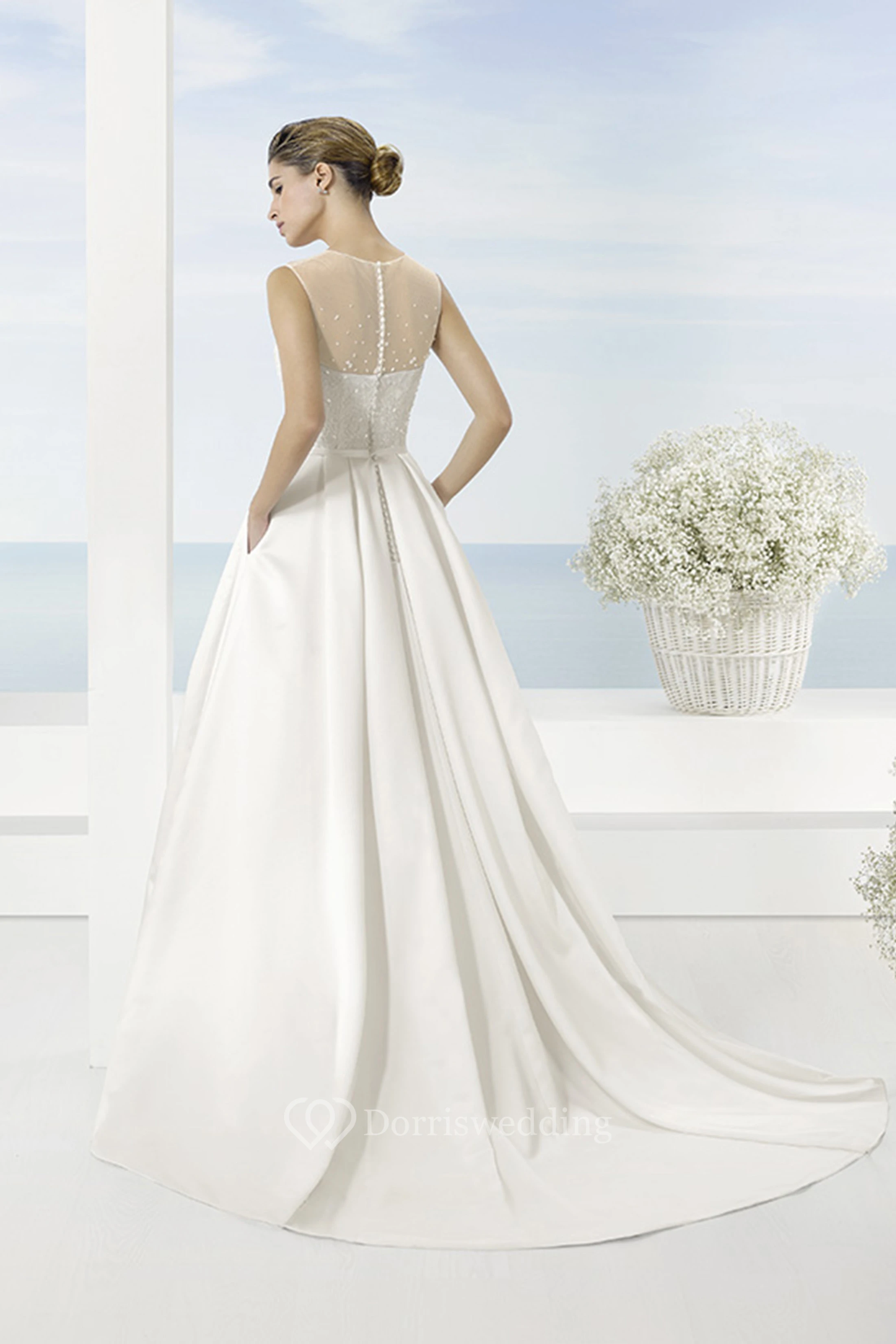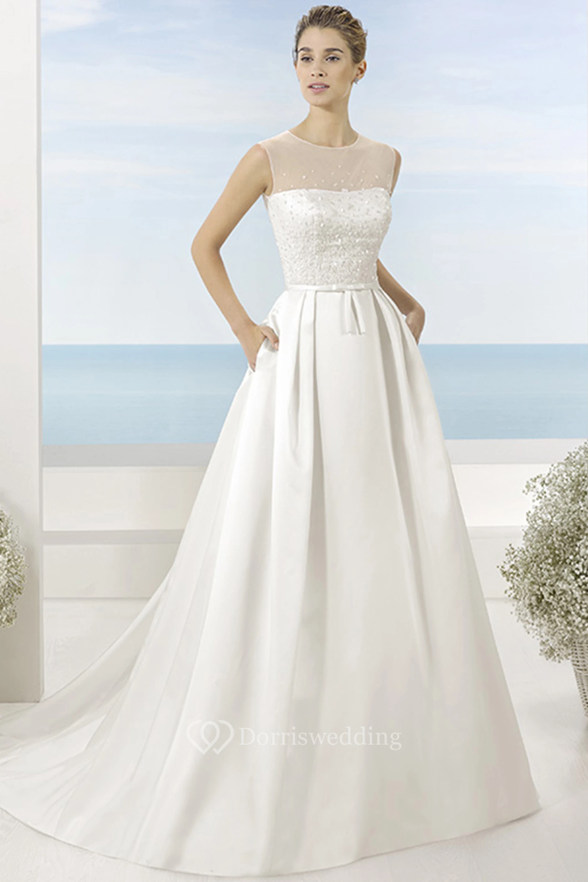 Scoop Floor-Length Beaded Satin Wedding Dress With Brush Train And Illusion