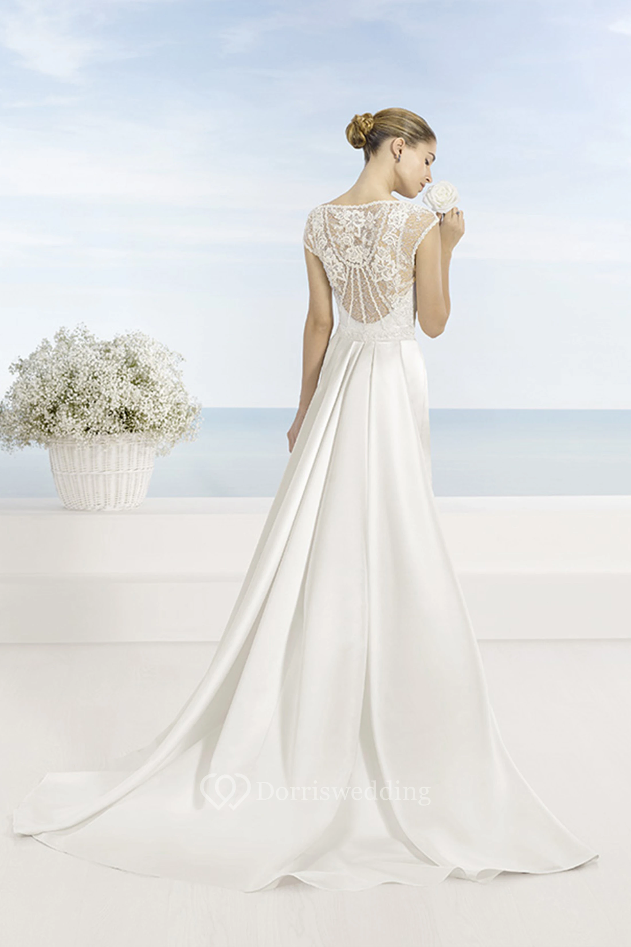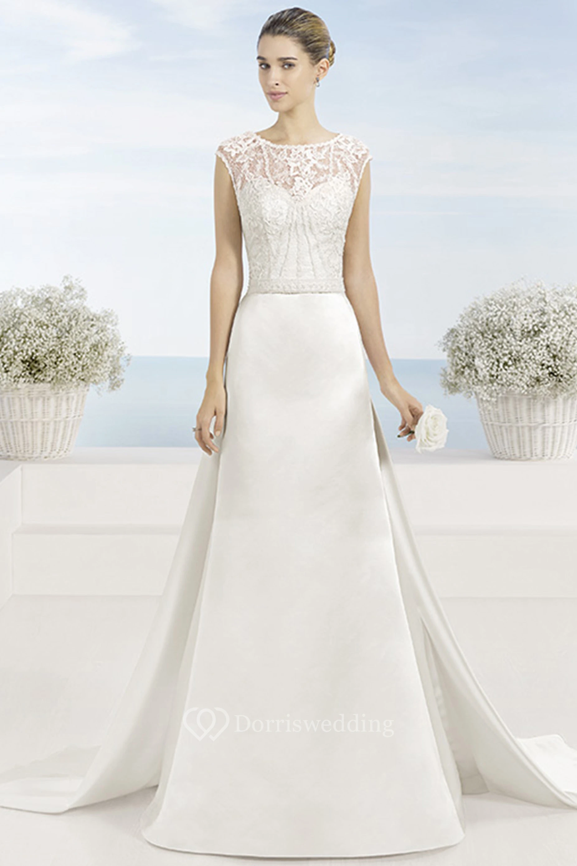 Scoop Floor-Length Beaded Satin Wedding Dress With Watteau Train And Illusion