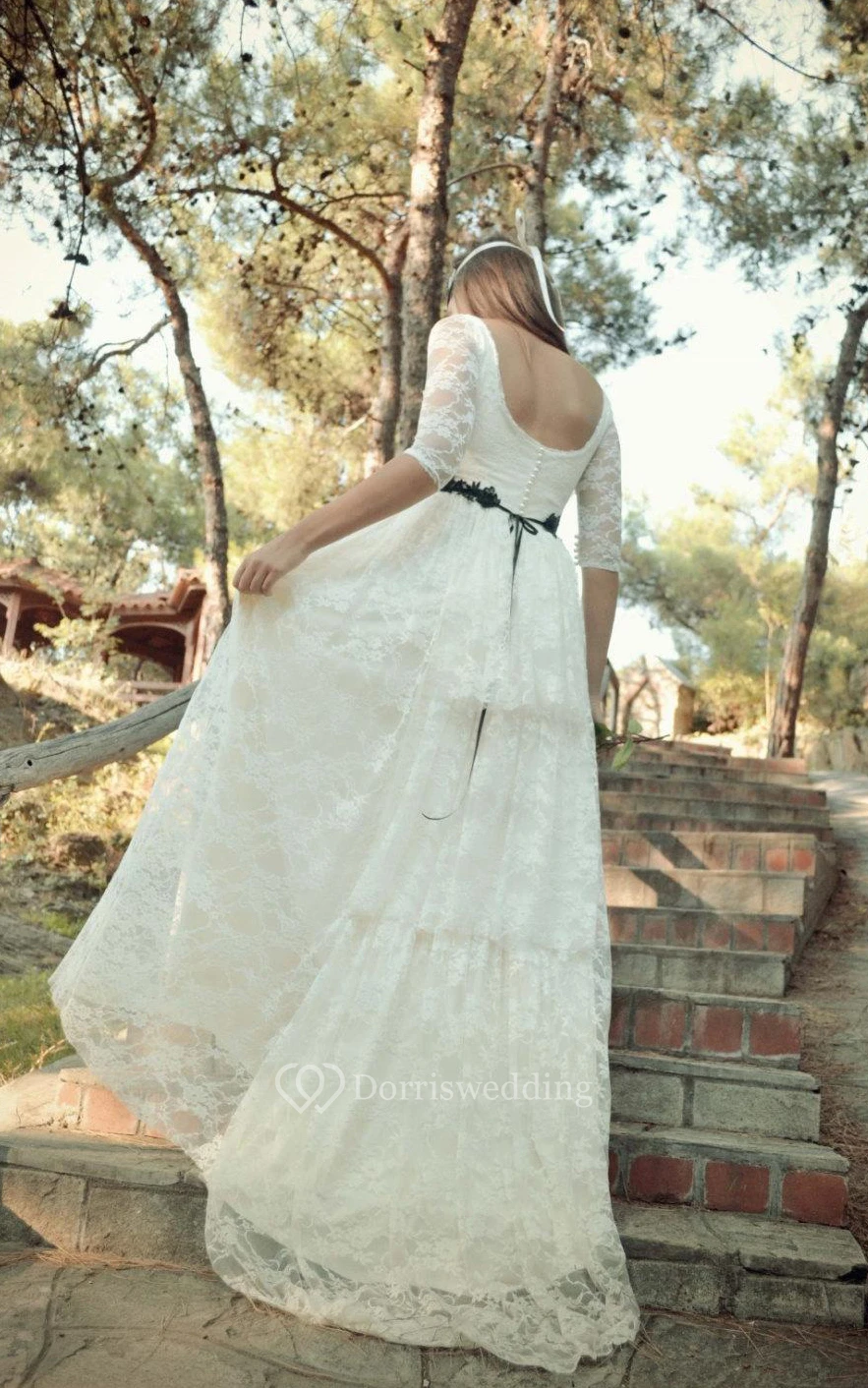 Scoop Half Illusion Sleeve Lace Boho Wedding Dress With Sash And Button Back