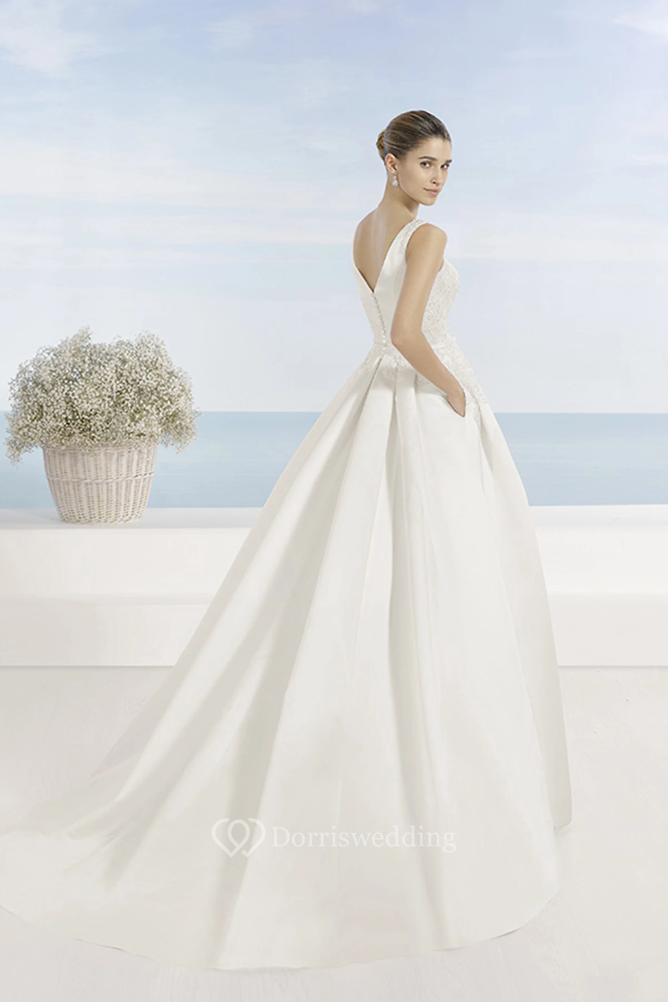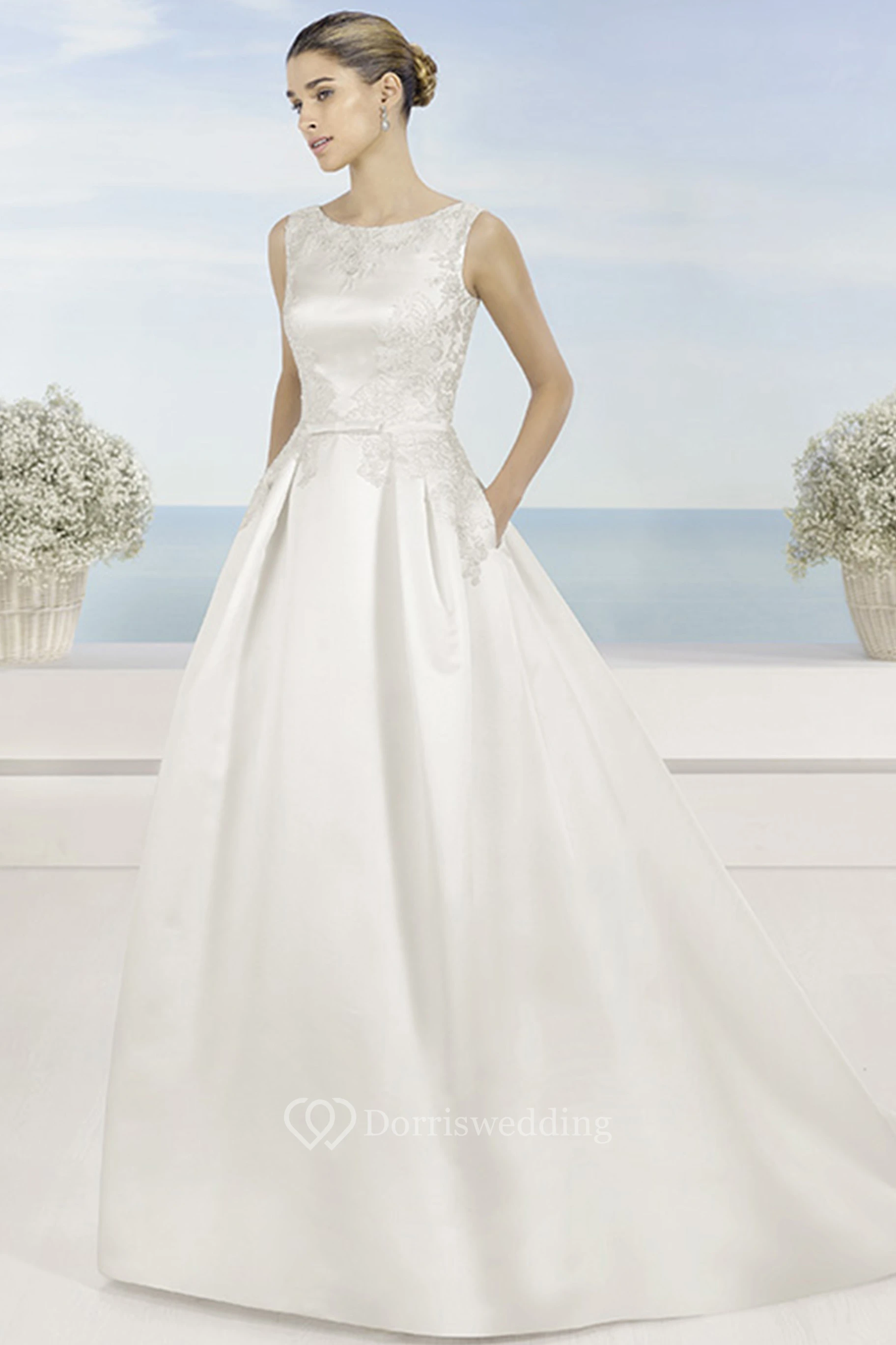 Scoop Long Appliqued Satin Wedding Dress With Sweep Train And V Back
