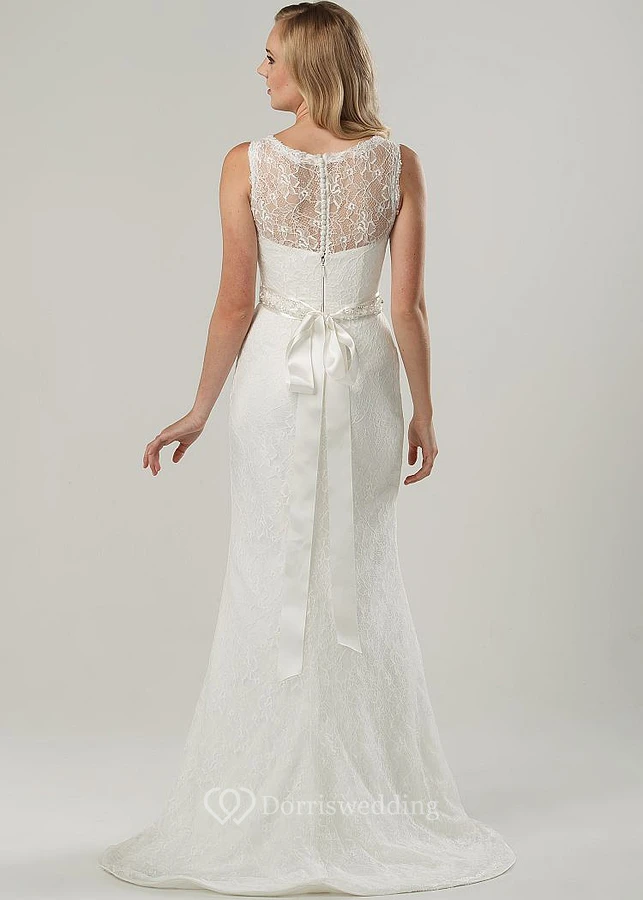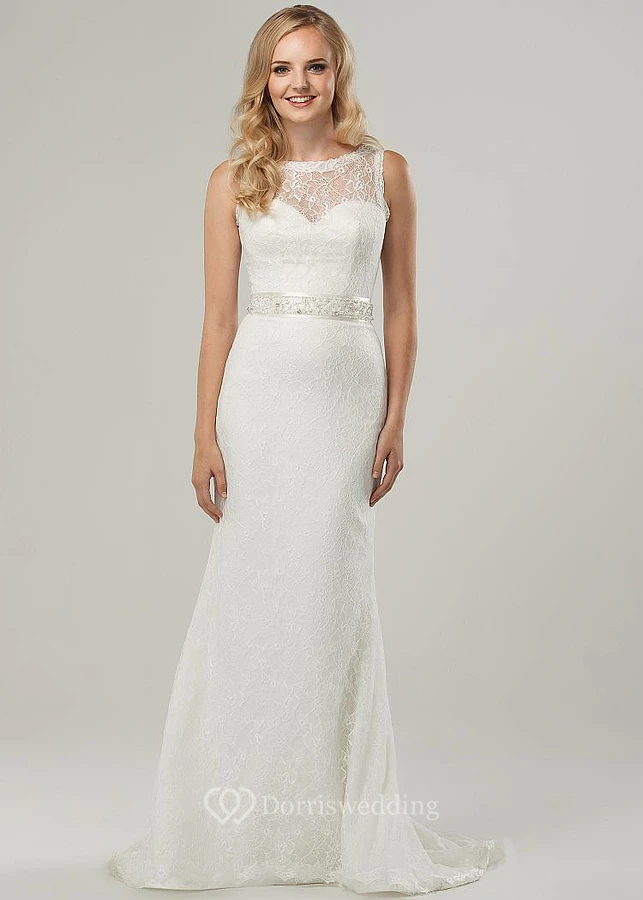 Scoop Long Jeweled Lace Wedding Dress With Sweep Train And Illusion