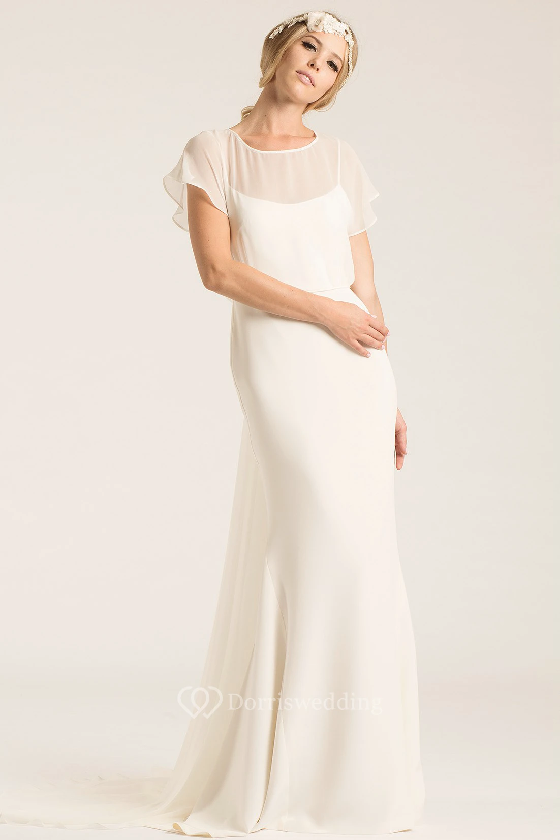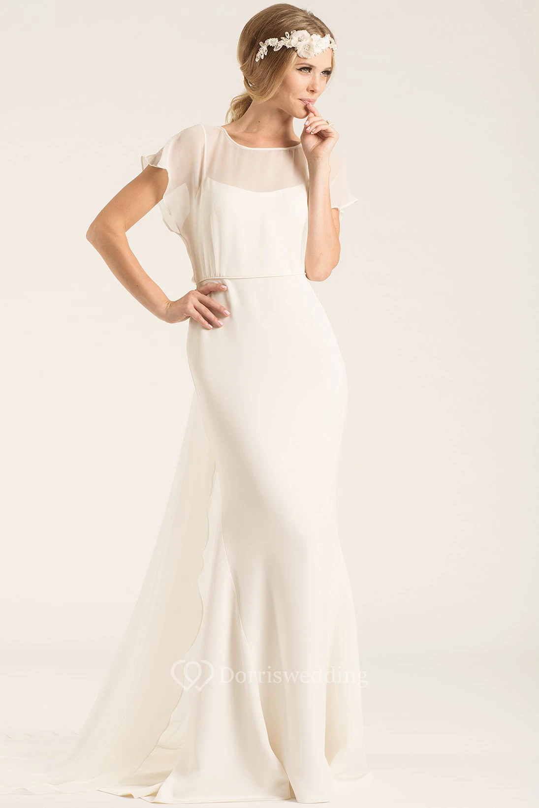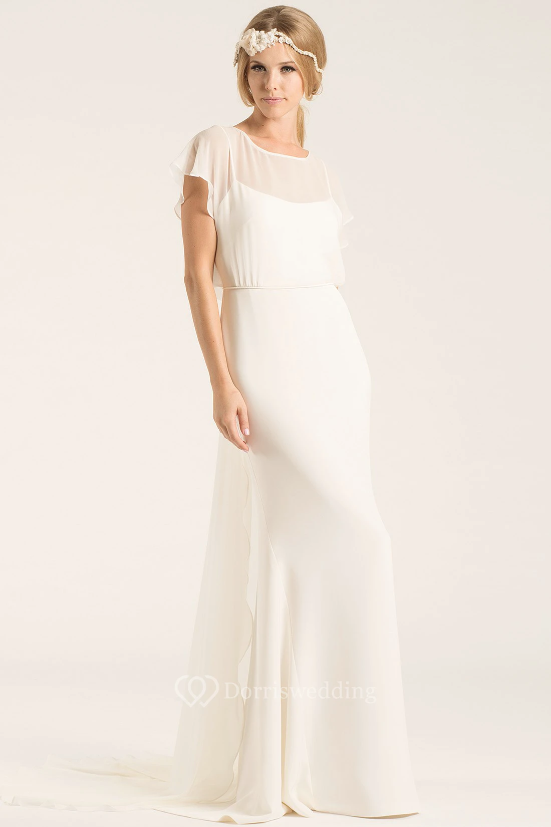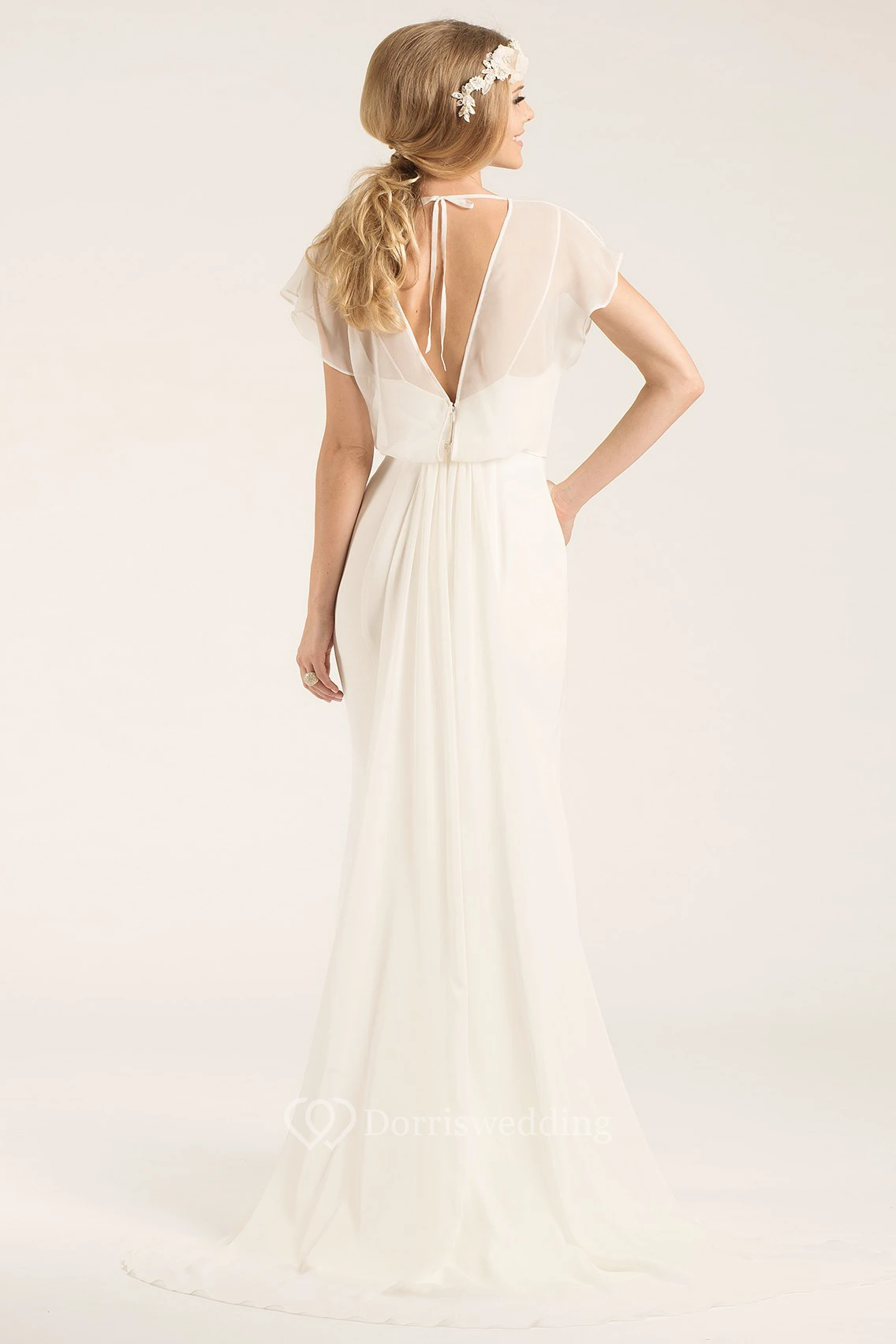 Scoop Long Poet-Sleeve Chiffon Wedding Dress With Court Train And V Back