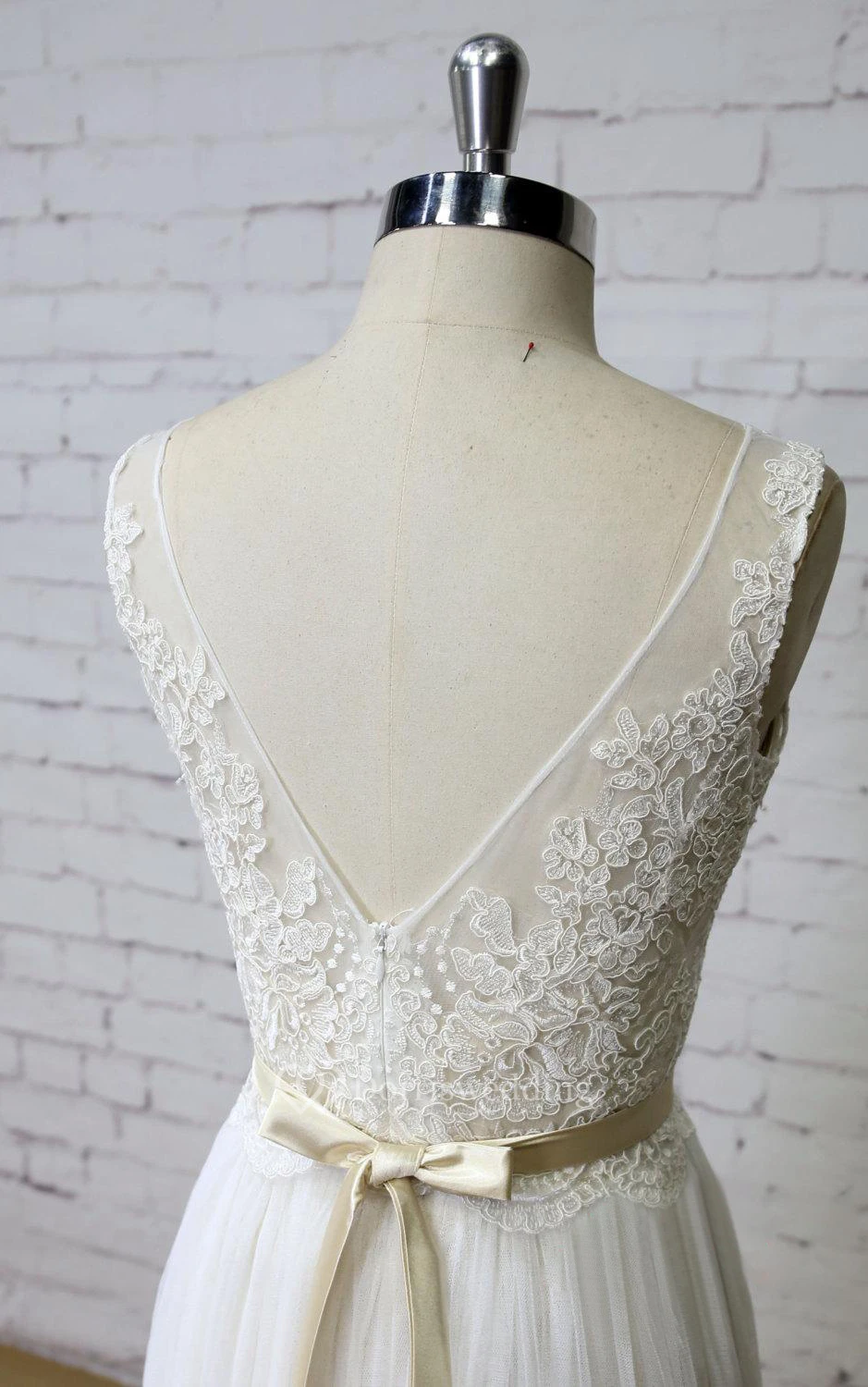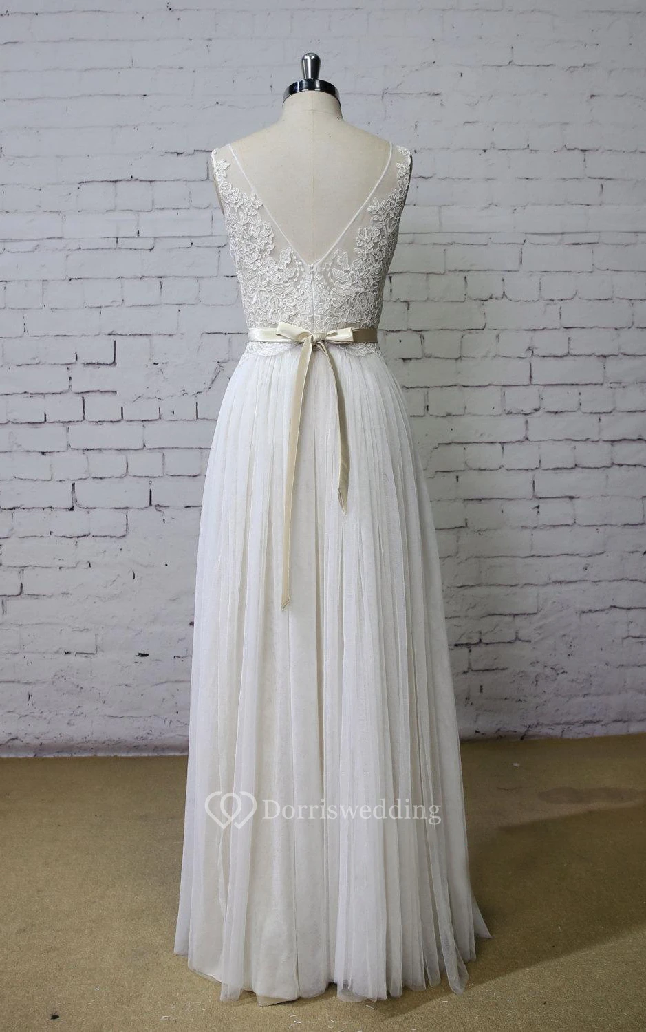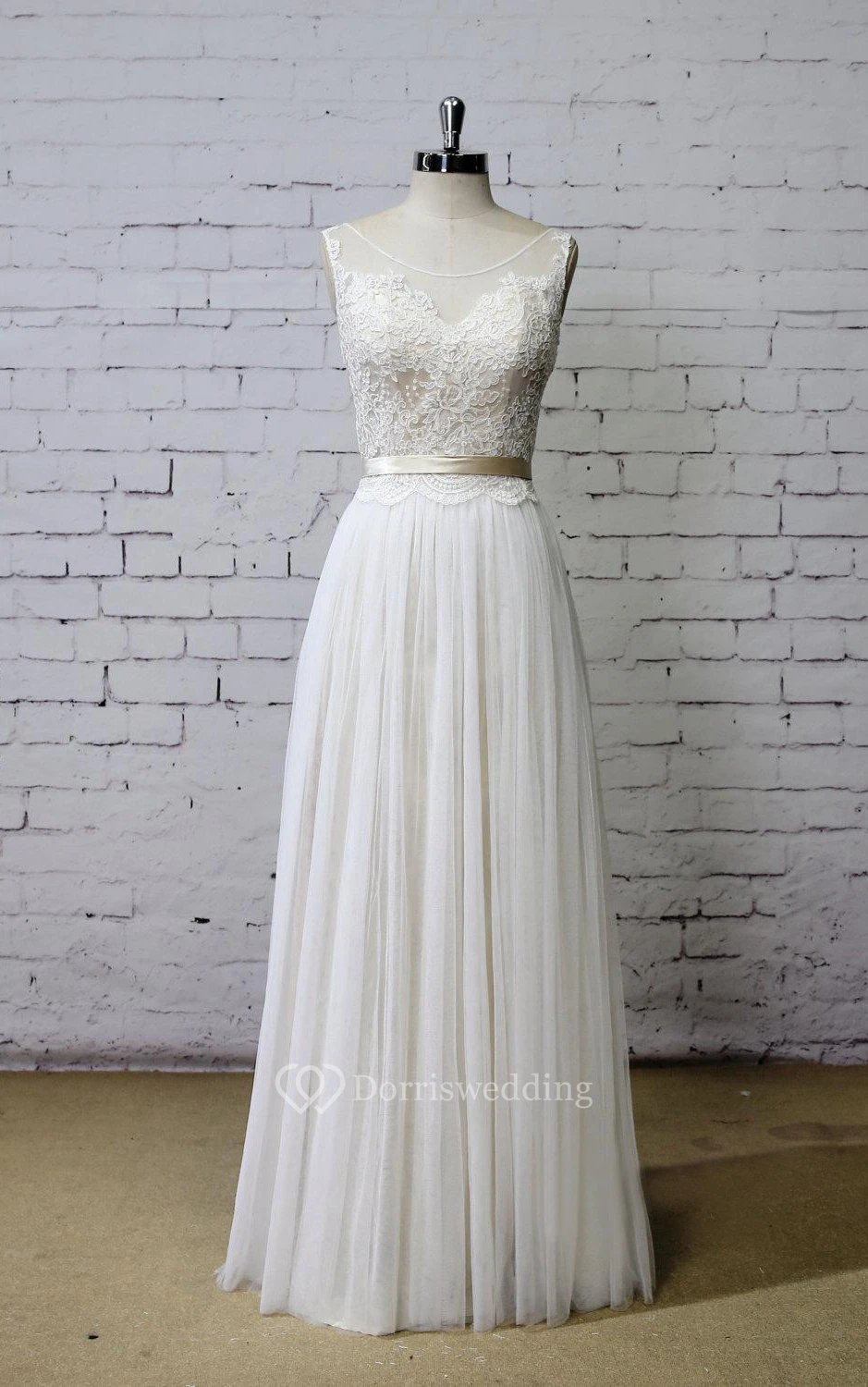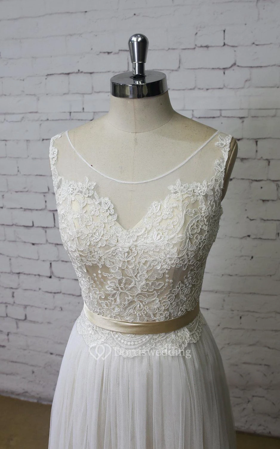 Scoop Neck A-Line Tulle and Lace Vow Renewal Dress With Pleats and Satin Sash