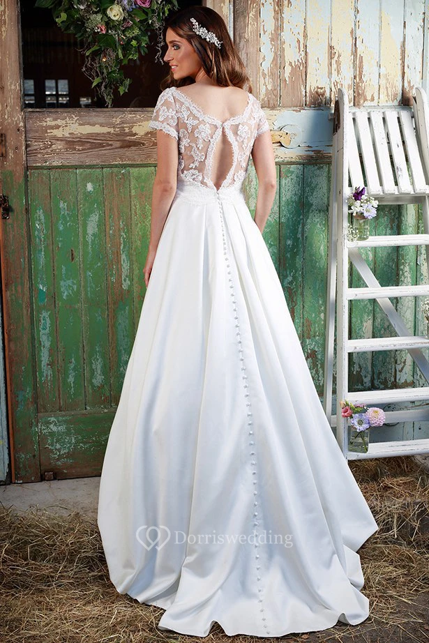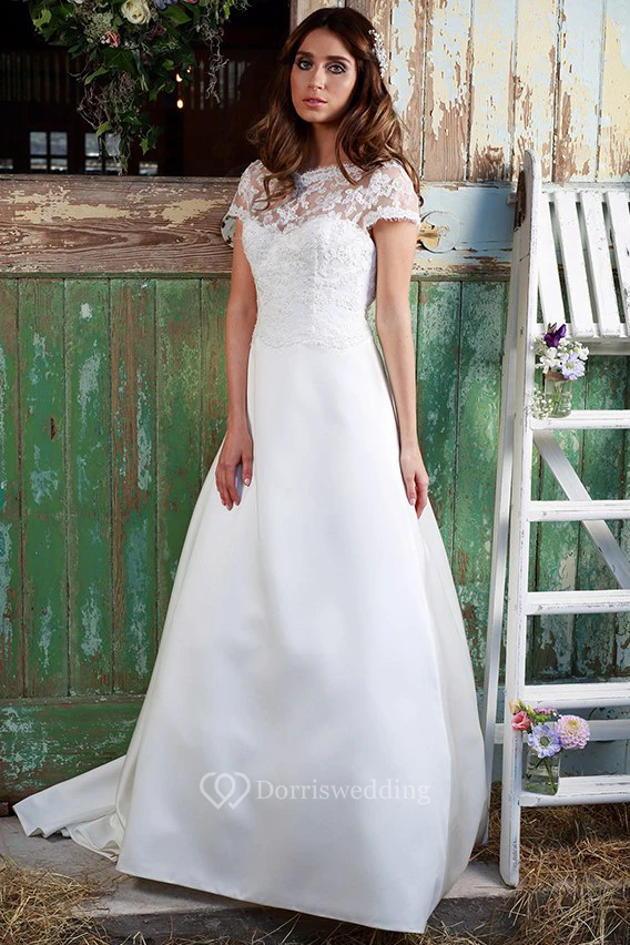 Scoop-Neck Appliqued Short-Sleeve Floor-Length Satin&Lace Wedding Dress