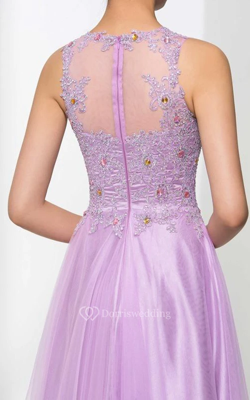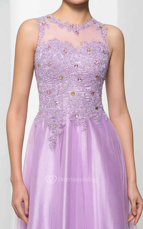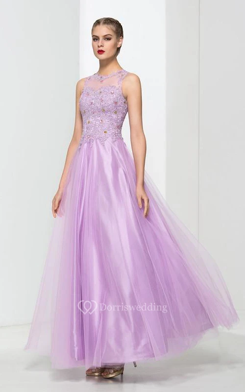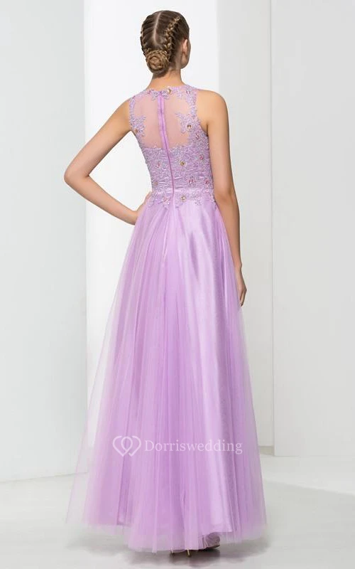 Scoop Neck Appliques Beading Long Prom Dress