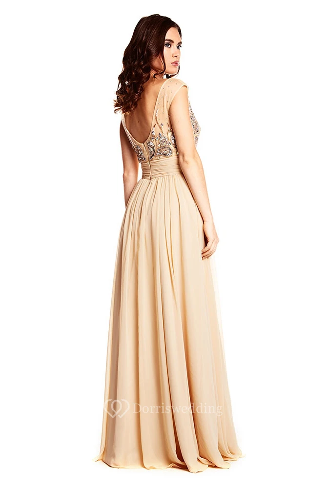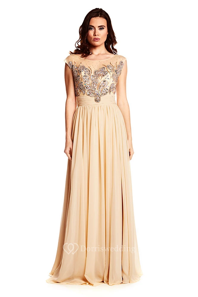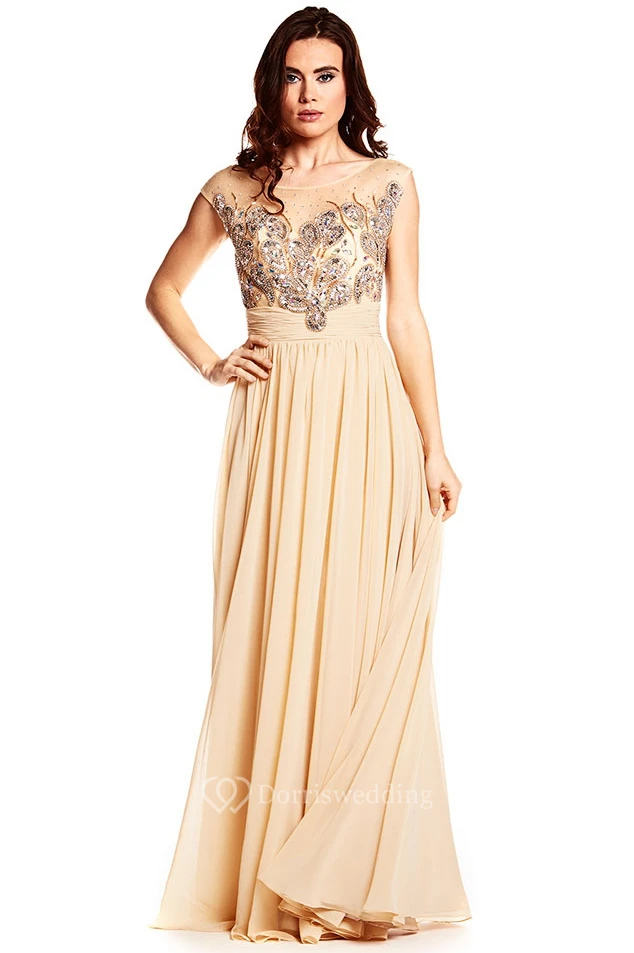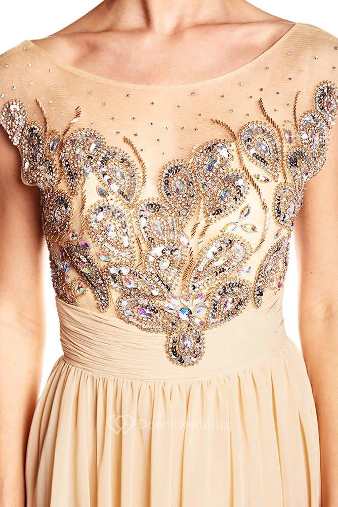 Scoop Neck Beaded Cap Sleeve Chiffon Prom Dress With Low-V Back