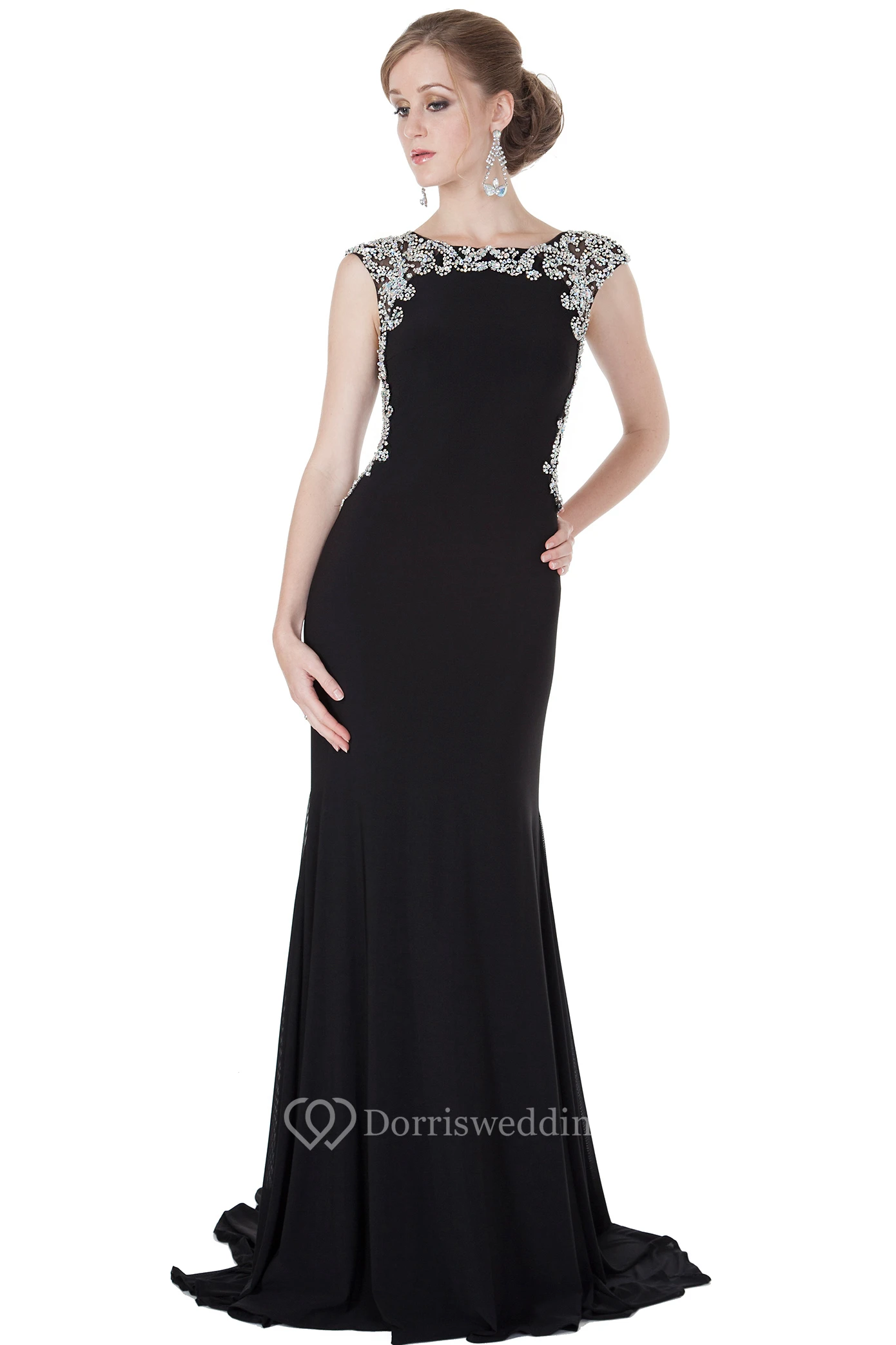 Scoop Neck Cap Sleeve Beaded Chiffon Evening Dress With Brush Train