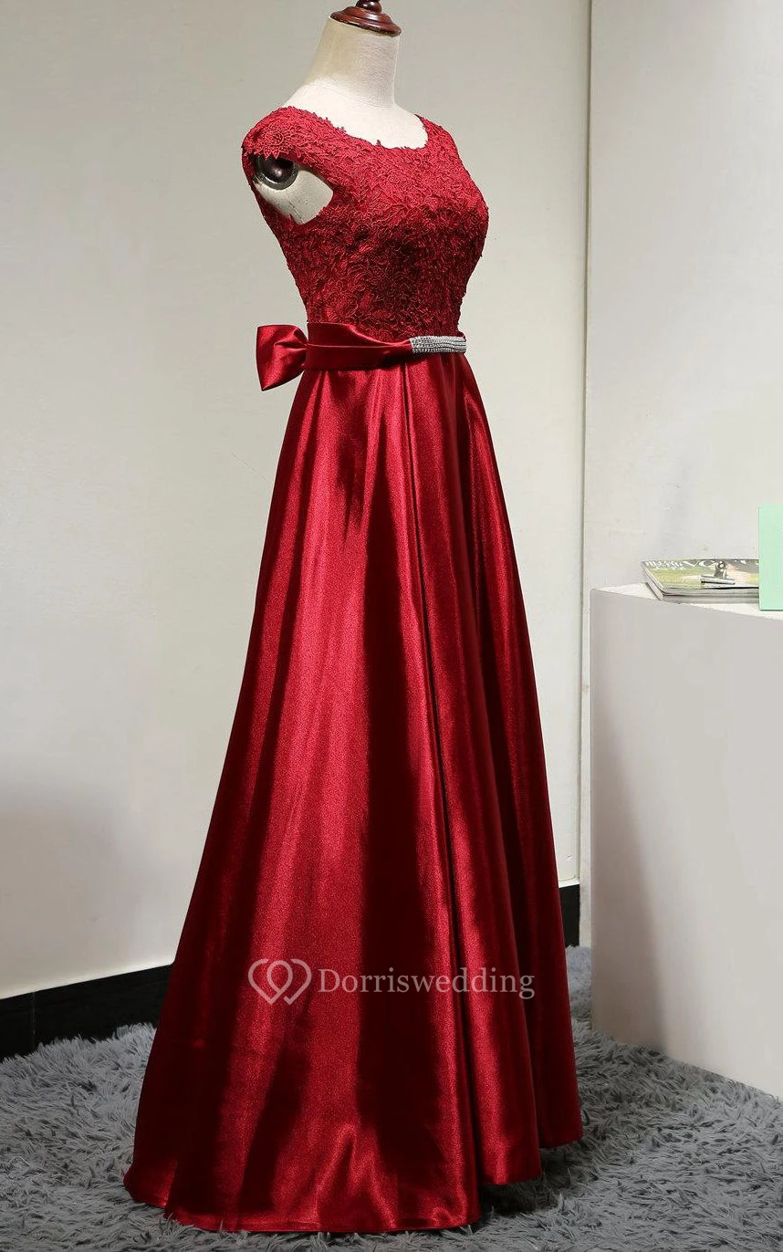 Scoop Neck Cap Sleeve Lace Bodice Satin A-line Long Dress With U Back