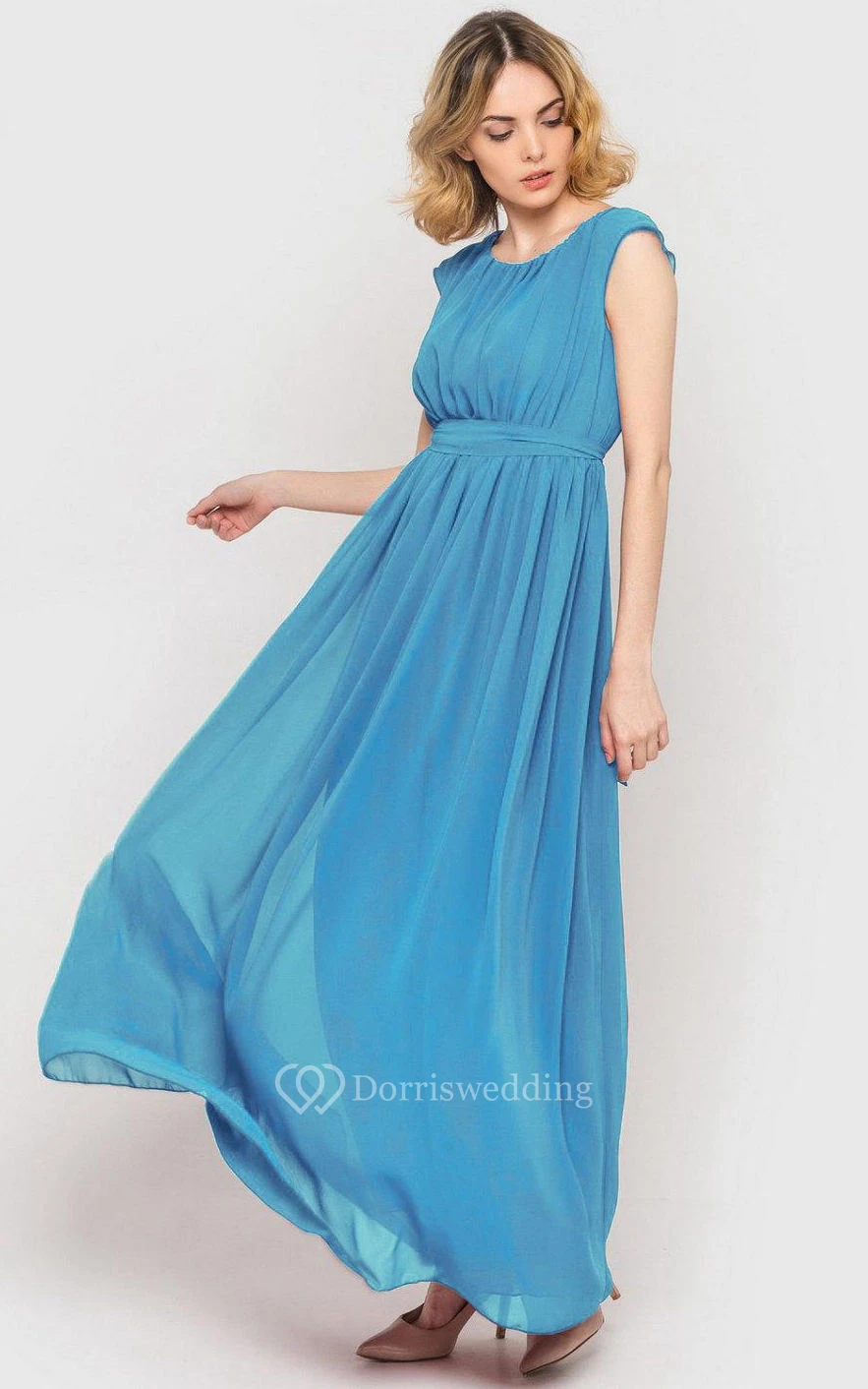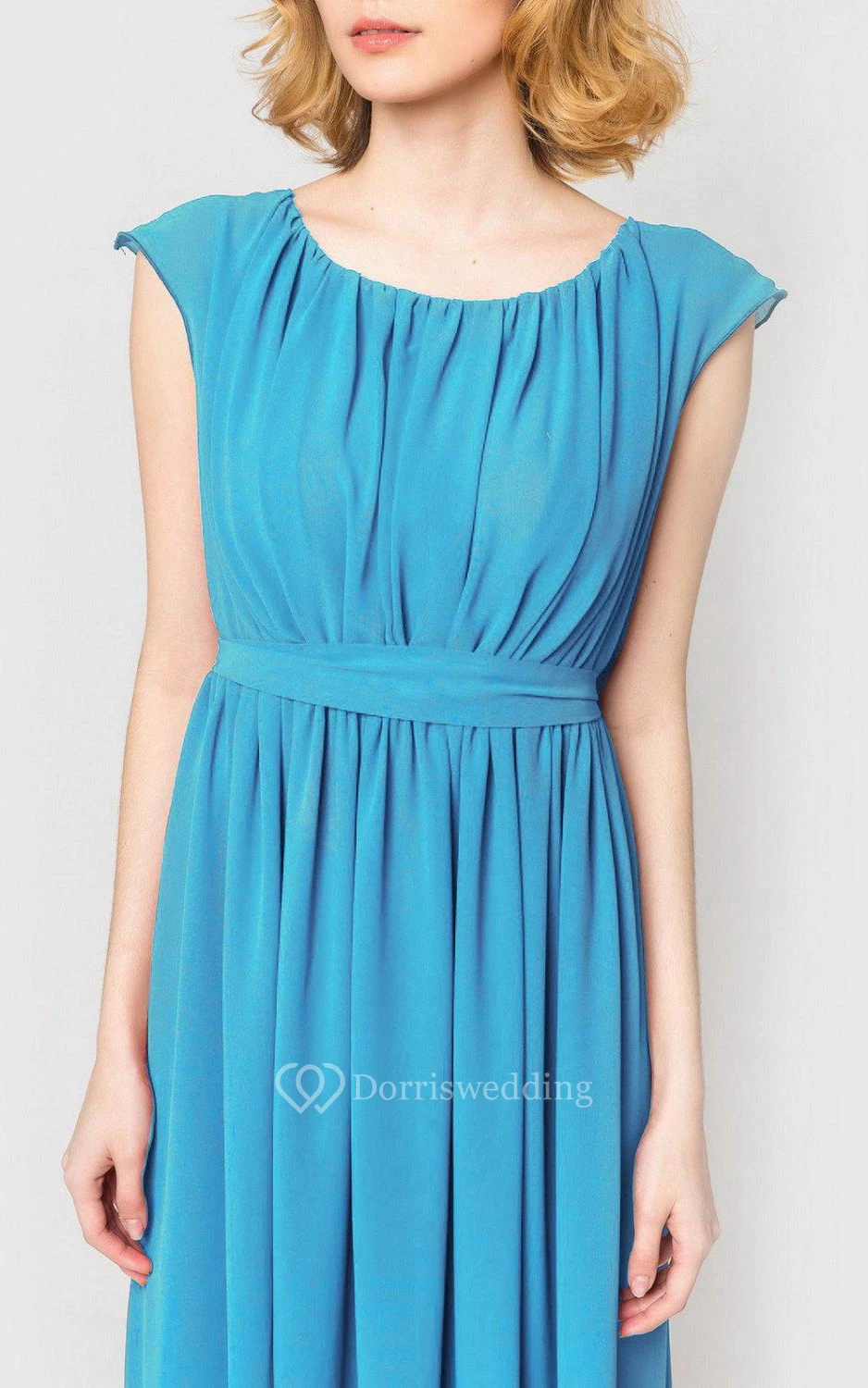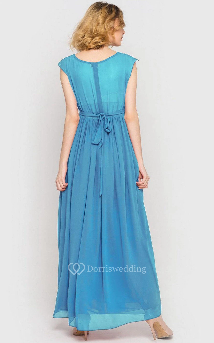 Scoop Neck Cap Sleeve Pleated A-line Chiffon Ankle Length Dress Sky Blue