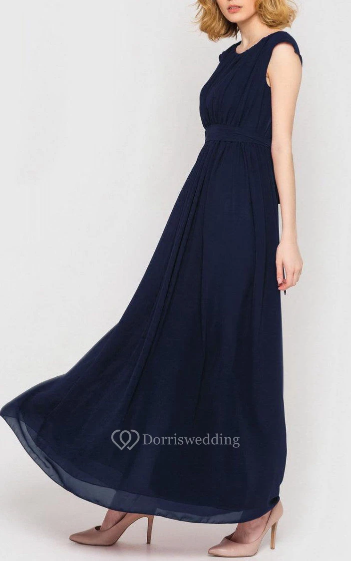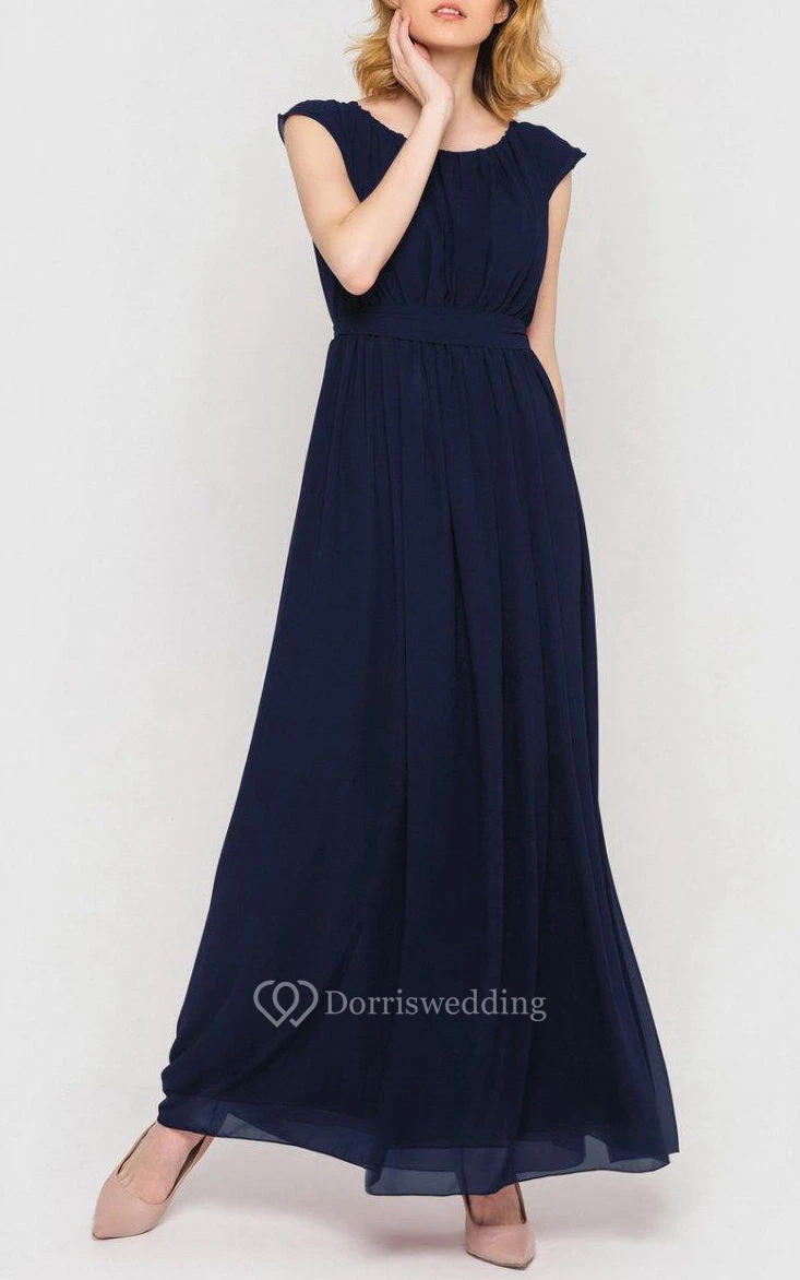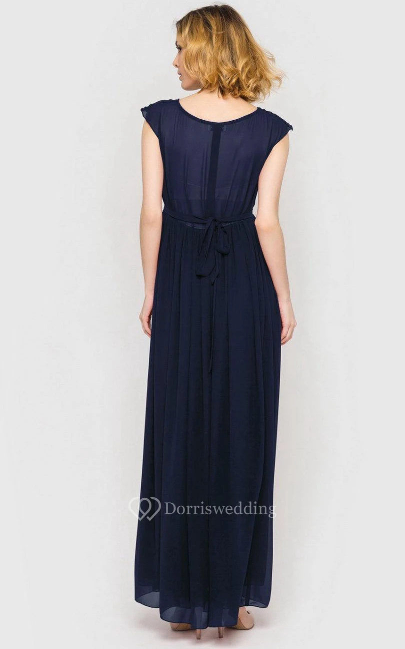 Scoop Neck Cap Sleeve Pleated A-line Chiffon Floor Length Dress With Bandage