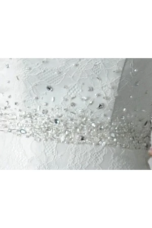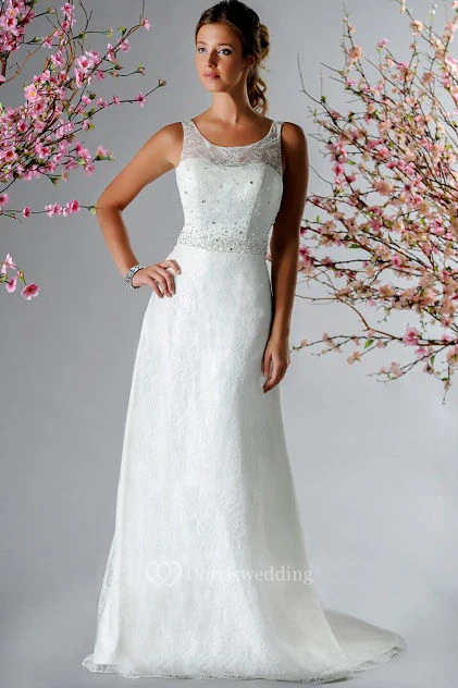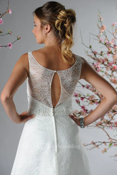 Scoop Neck Crystal Top A-Line Lace Gown With Back Button And Keyhole