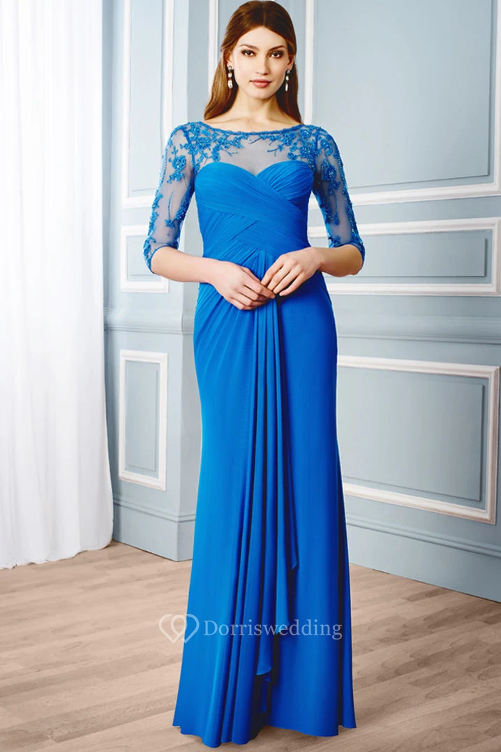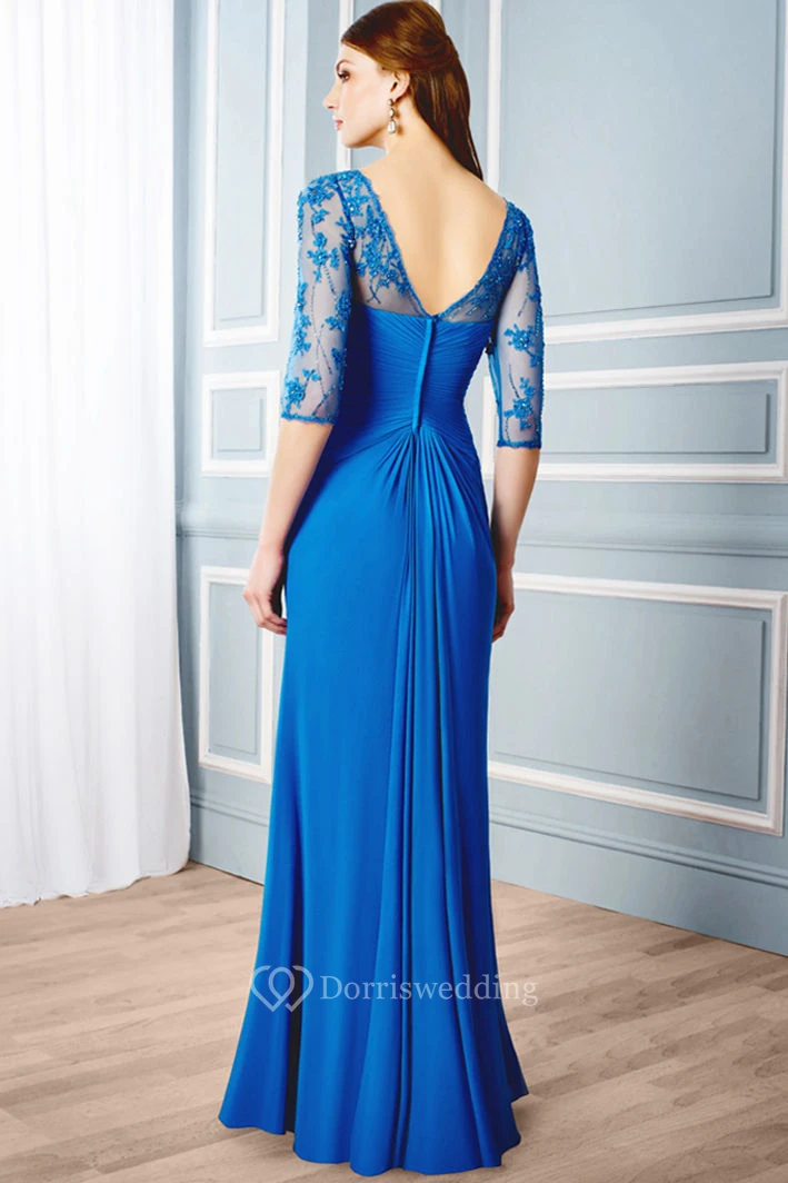 Scoop-Neck Floor-Length Criss-Cross Half-Sleeve Jersey Formal Dress With Draping And Appliques