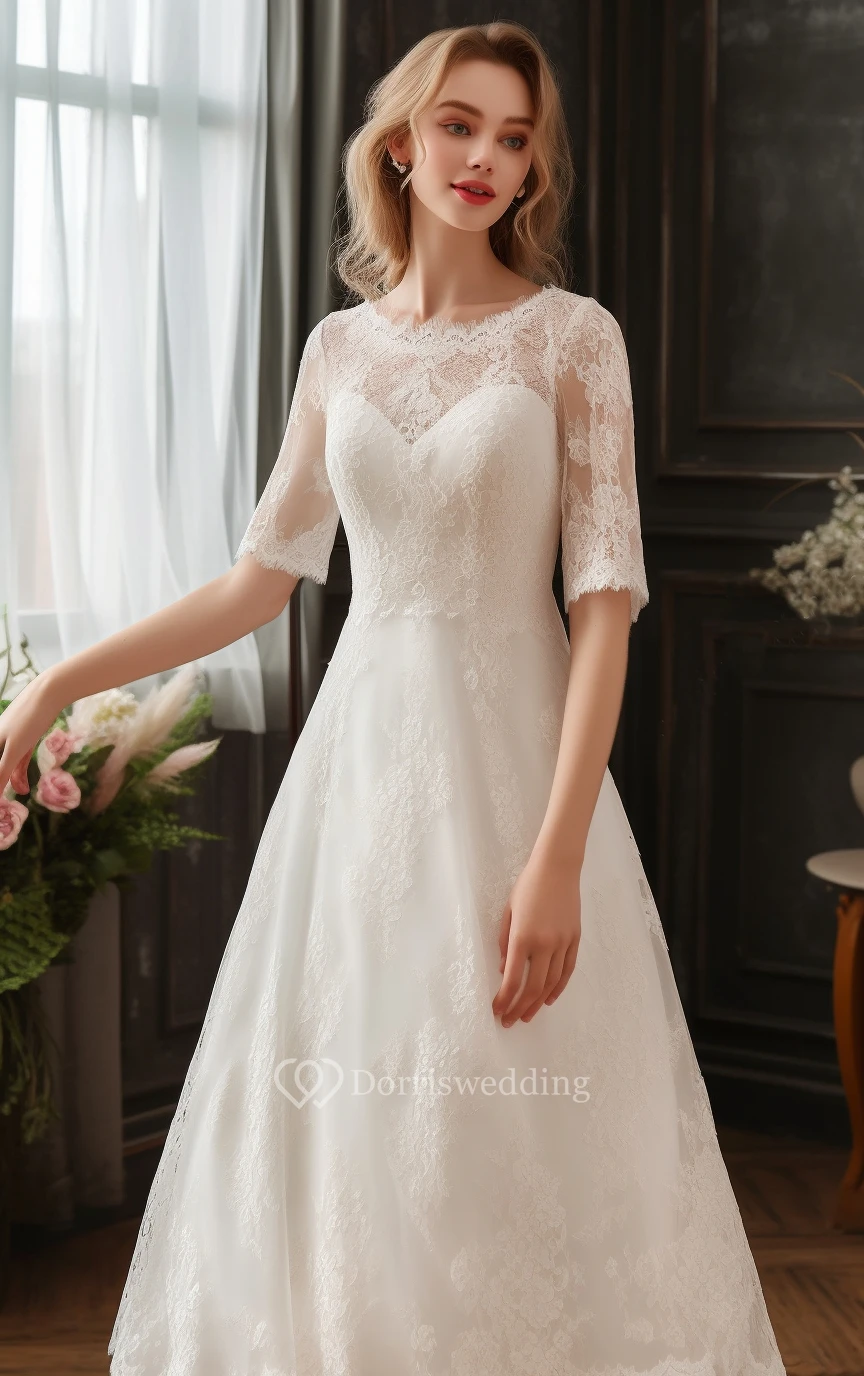 Scoop-neck Half-sleeve Lace A-line Elegant Tea Length Wedding Dress