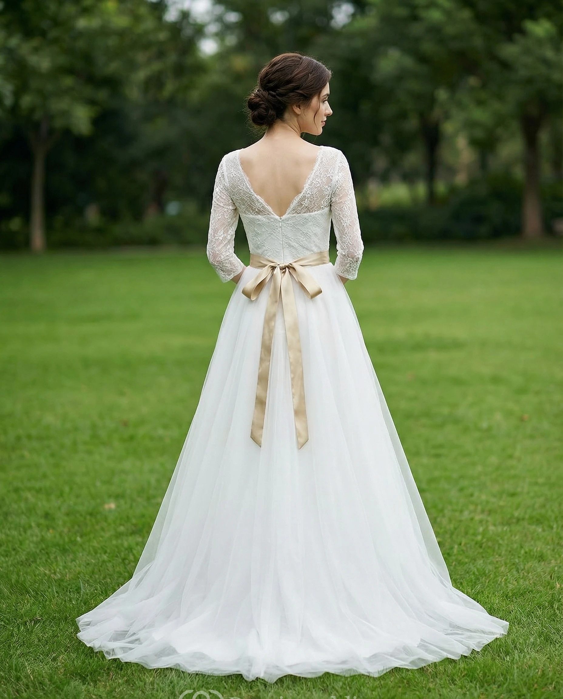 To make it easier for you to walk post-ceremony and dance, our seamstresses add buttons, or ribbons into the dress by lifting up the train or tucking it into itself.