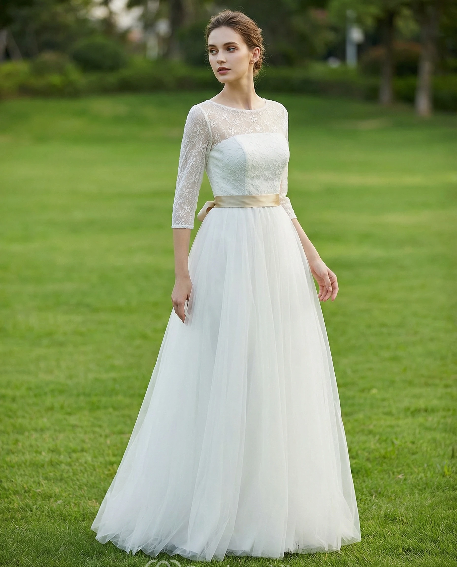 Scoop Neck Lace Bodice Tulle Wedding Dress