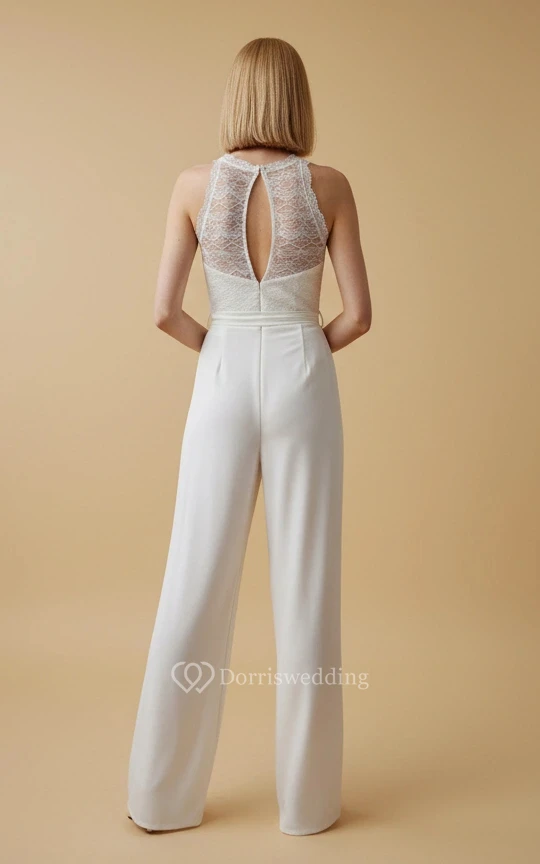 Scoop Neck Lace Wide Leg Wedding Jumpsuit with Bow Belt