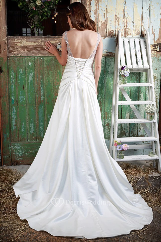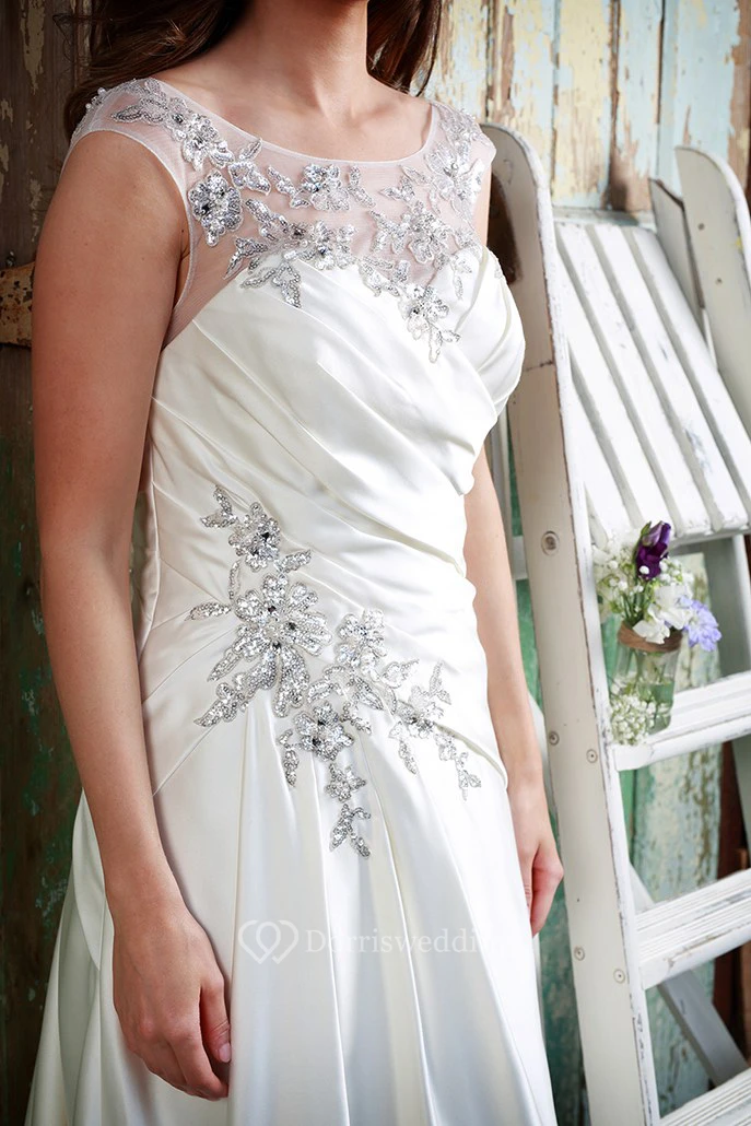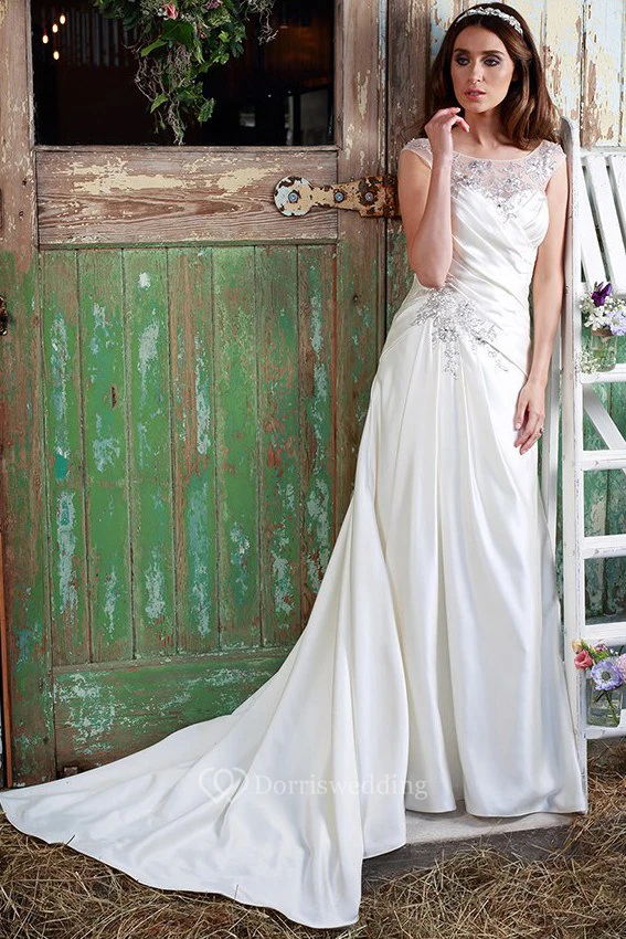 Scoop-Neck Maxi Ruched Cap-Sleeve Satin Wedding Dress With Crystal Detailing