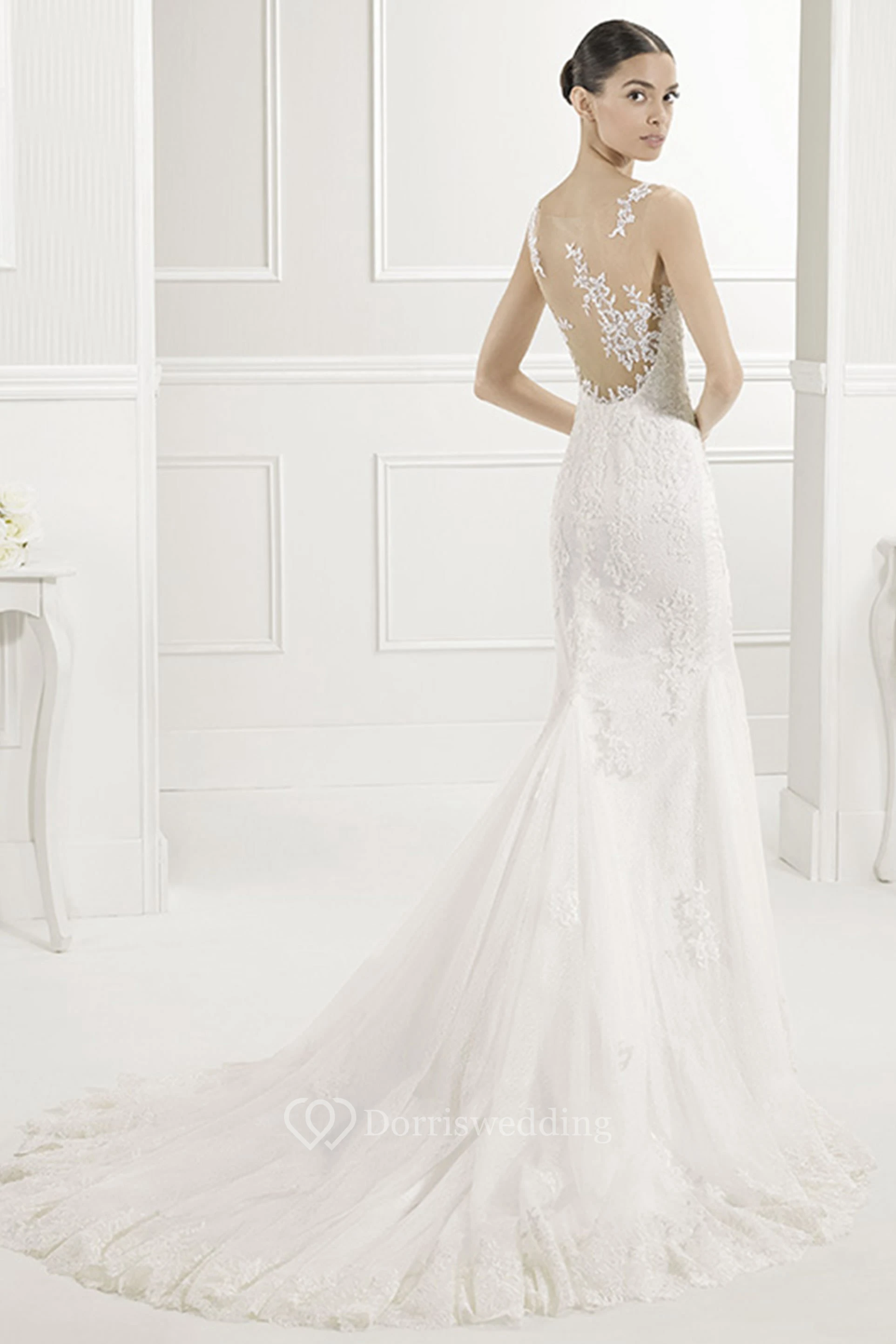 Scoop Neck Sheath Lace Bridal Gown With Appliqued Illusion Back