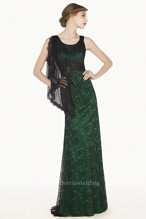 Scoop Neck Sheath Long Allover Lace Prom Dress With Shoulder Side Drape
