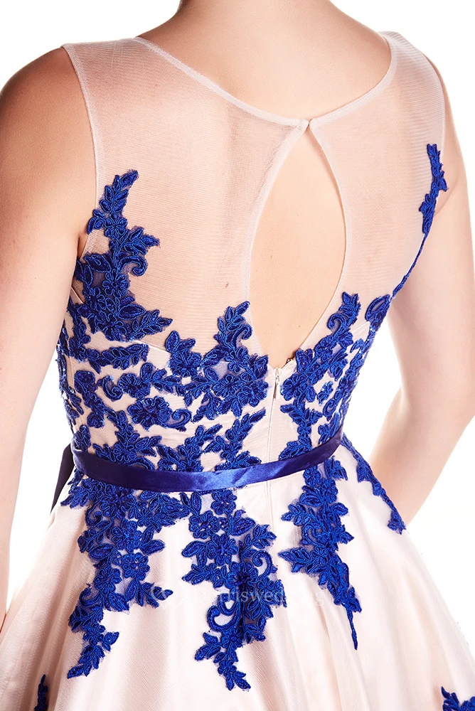 Scoop-Neck Short Appliqued Organza Prom Dress With Ribbon And Illusion
