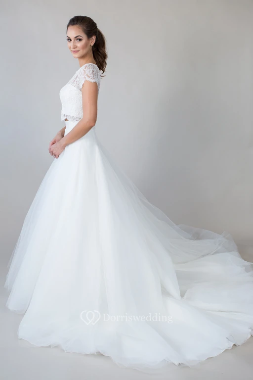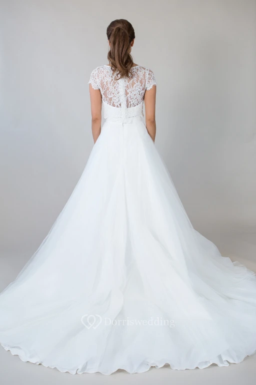 Scoop-Neck Short-Sleeve Tulle Wedding Dress With Lace And Illusion