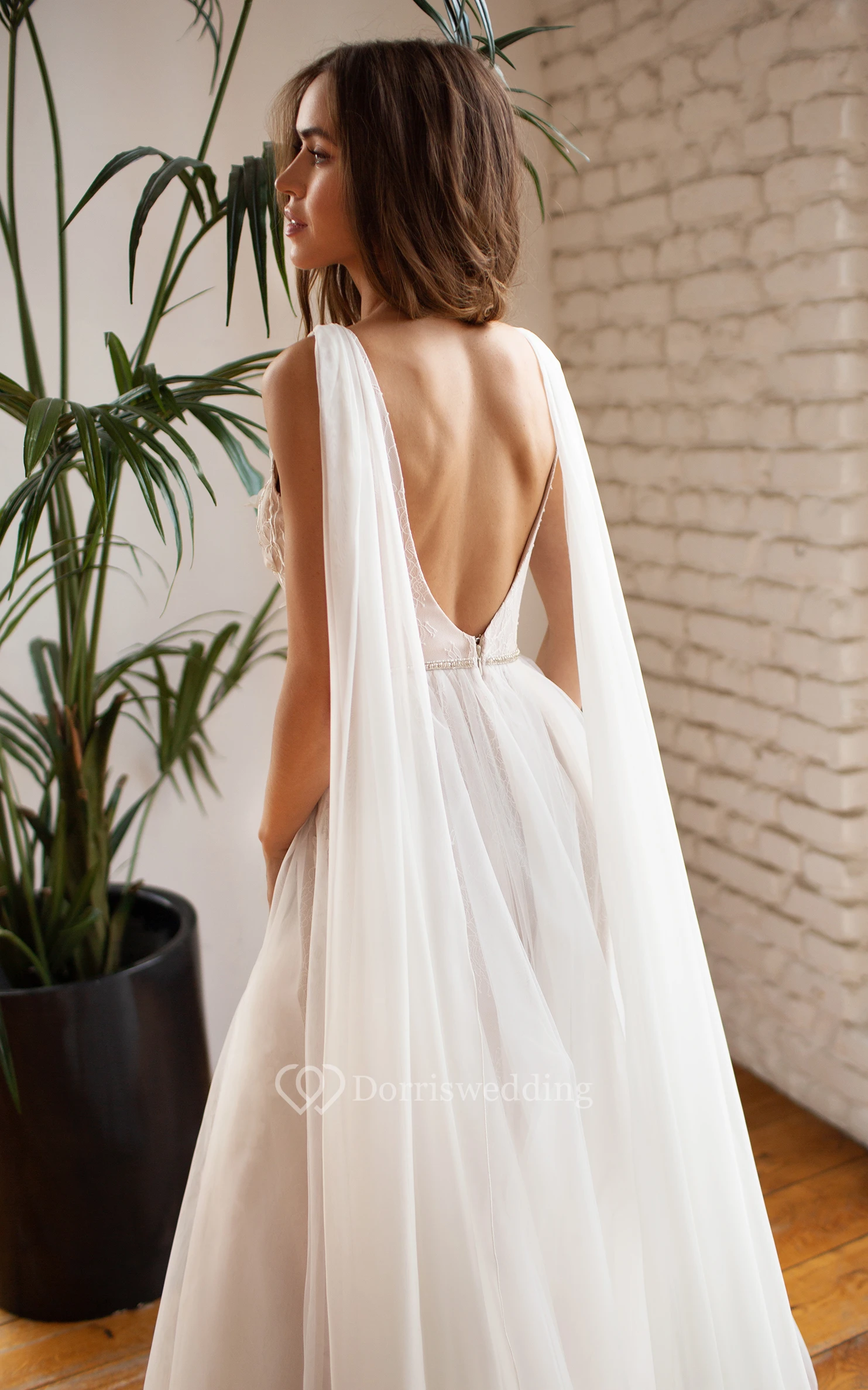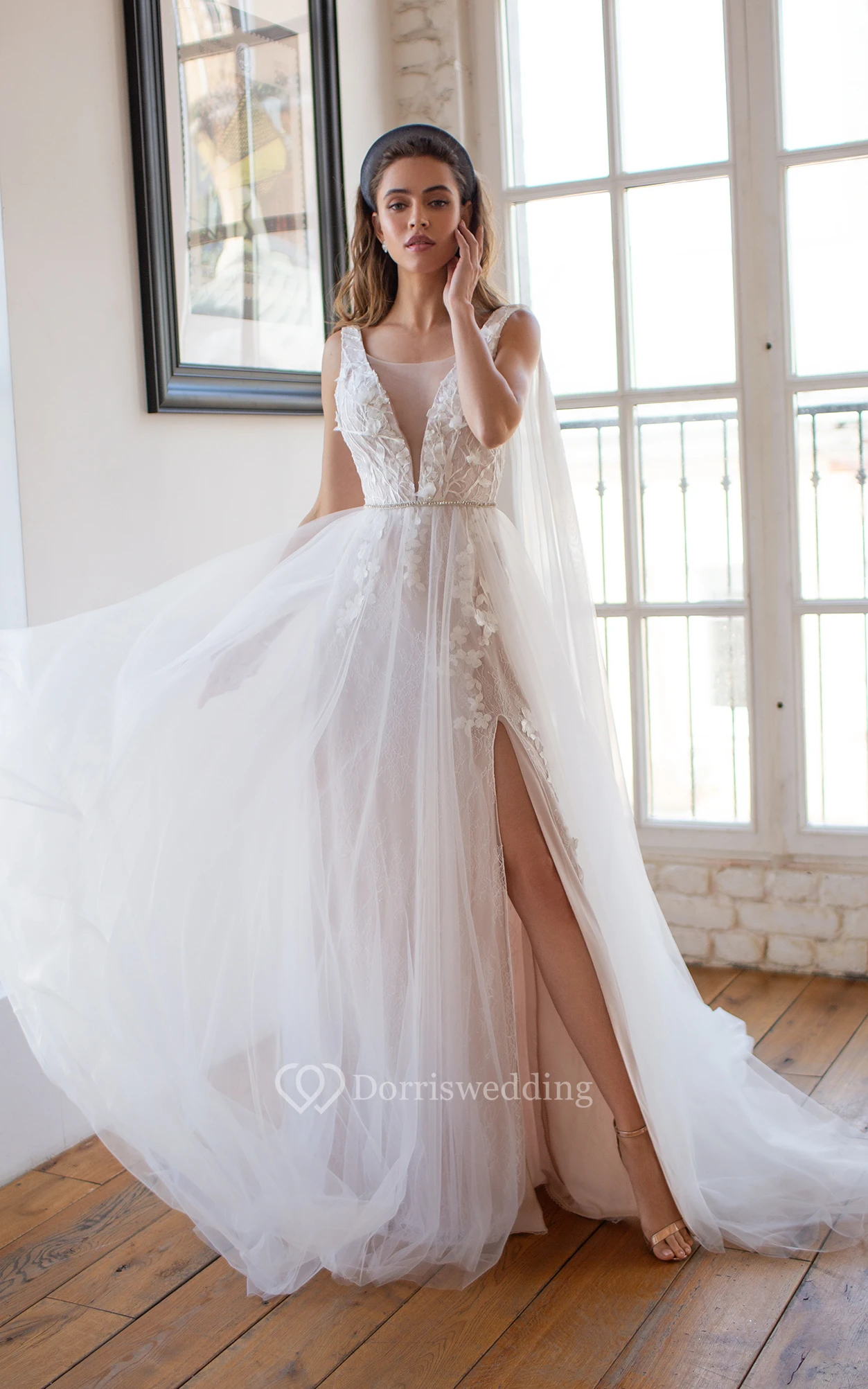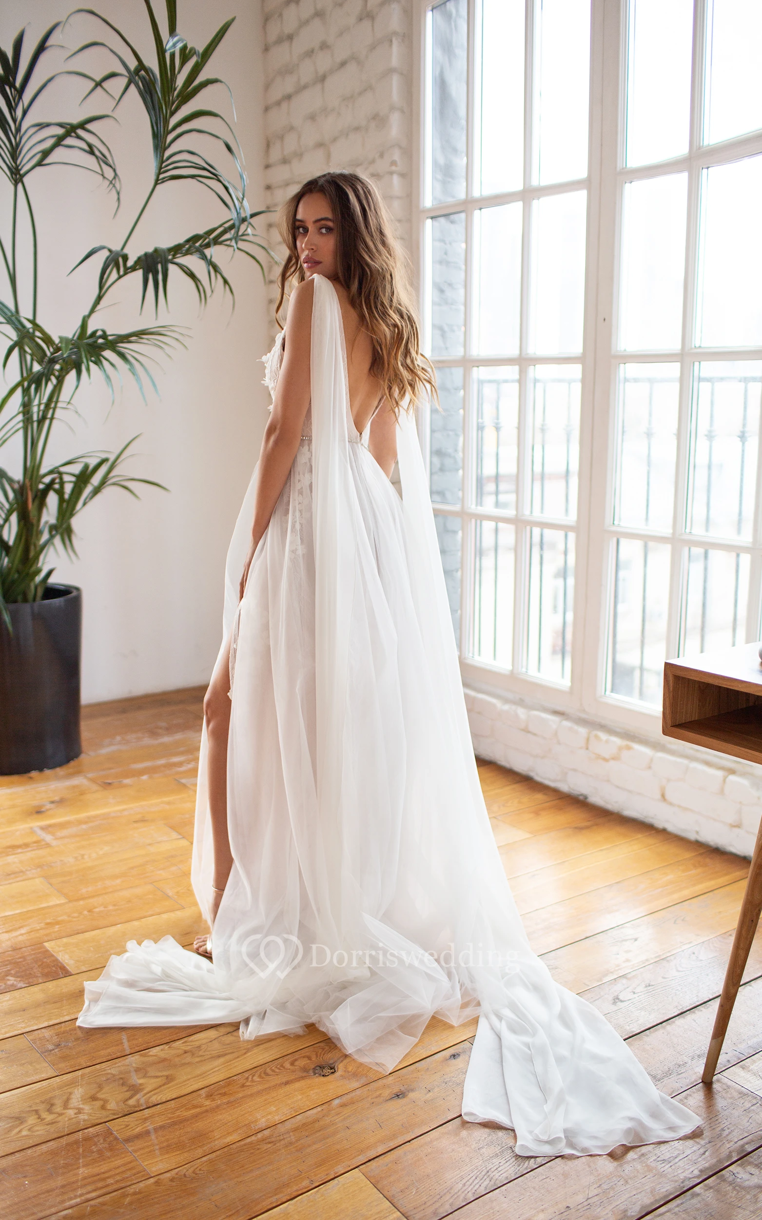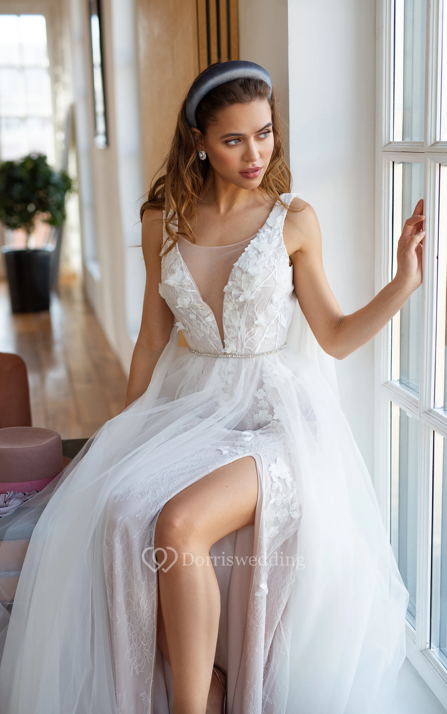 Scoop-neck Sleeveless Empire Tulle Front Split Lace Applique Deep-v Back Beach Wedding Dress