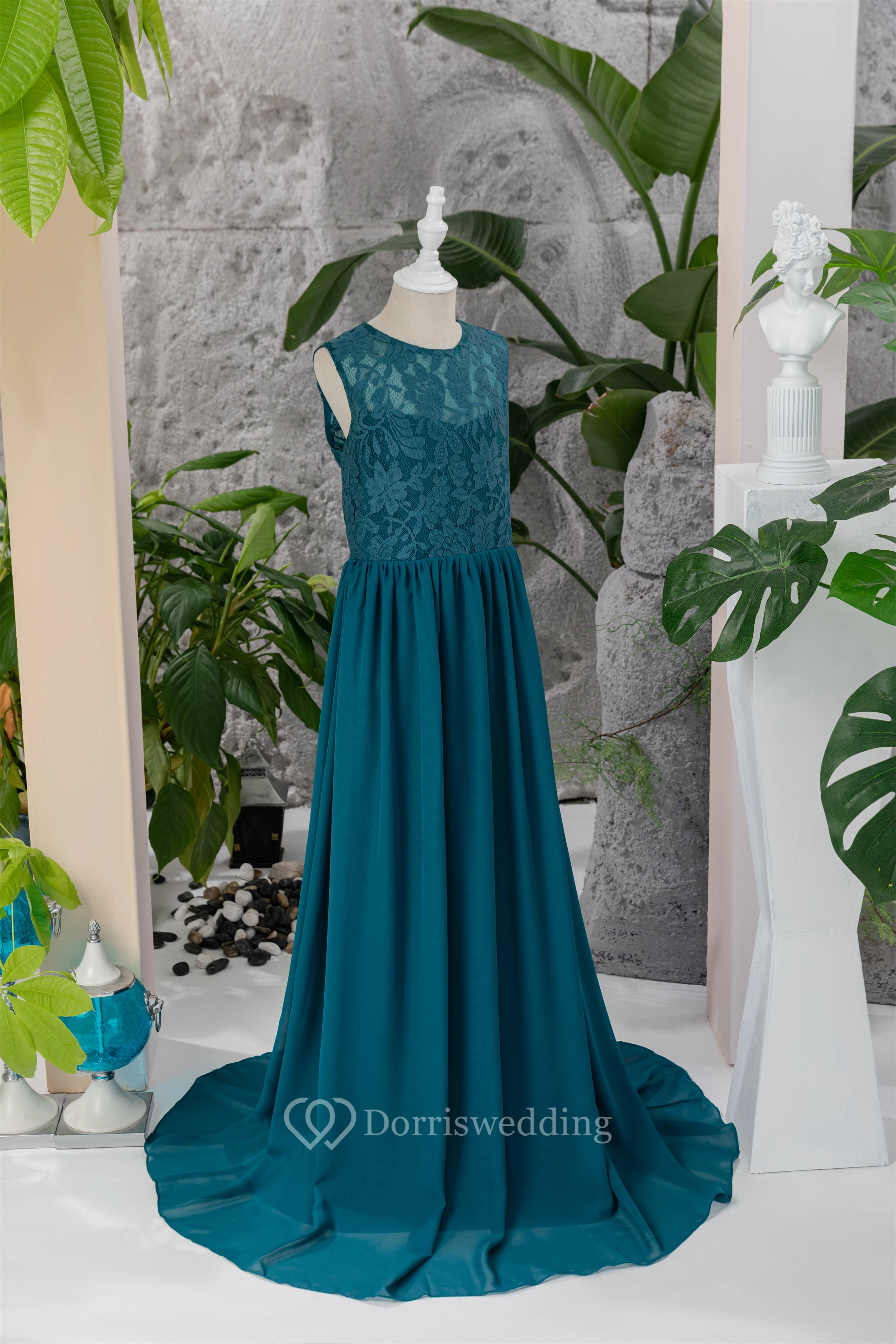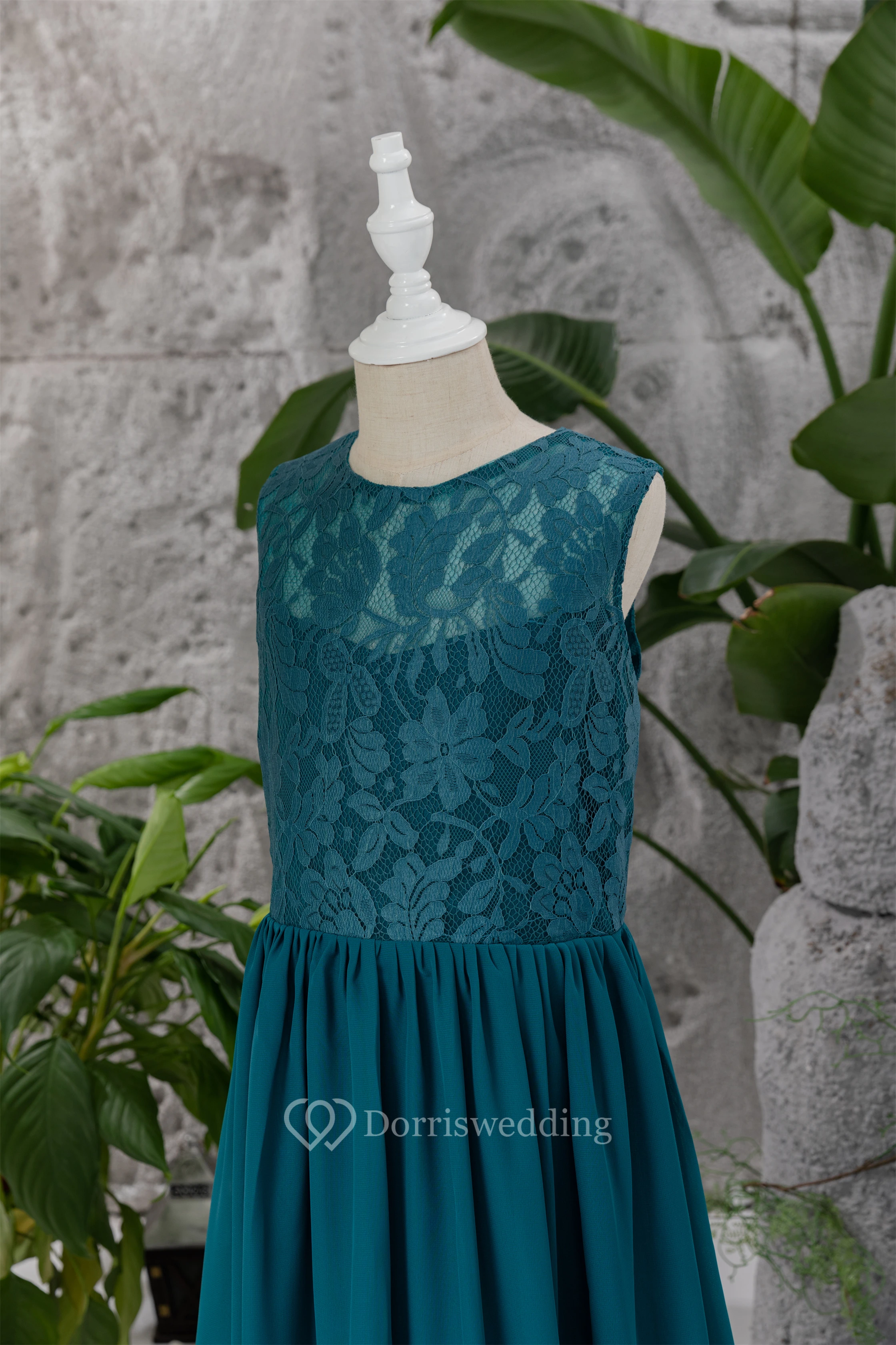 Scoop-neck Sleeveless Floor-length Ink Navy Flowergirl Dress with Lace Top