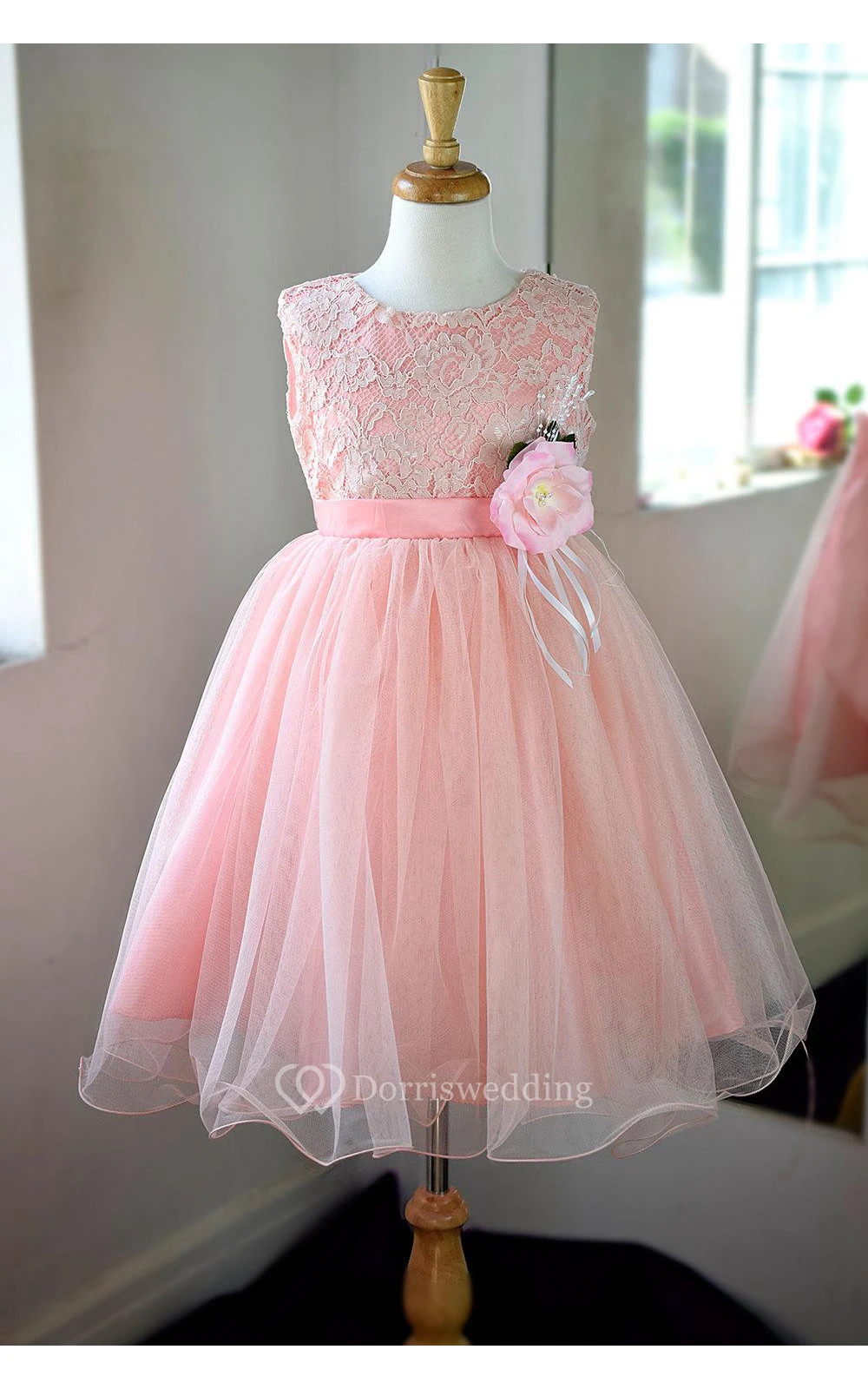 Scoop Neck Sleeveless Pleated Ankle Length Tulle Dress With Flower Sash