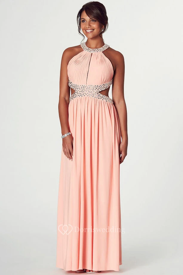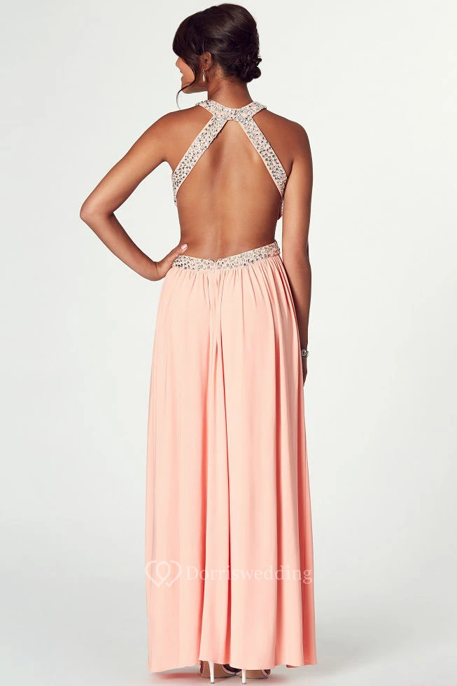 Scoop Neck Sleeveless Ruched Chiffon Prom Dress With Beading And Backless
