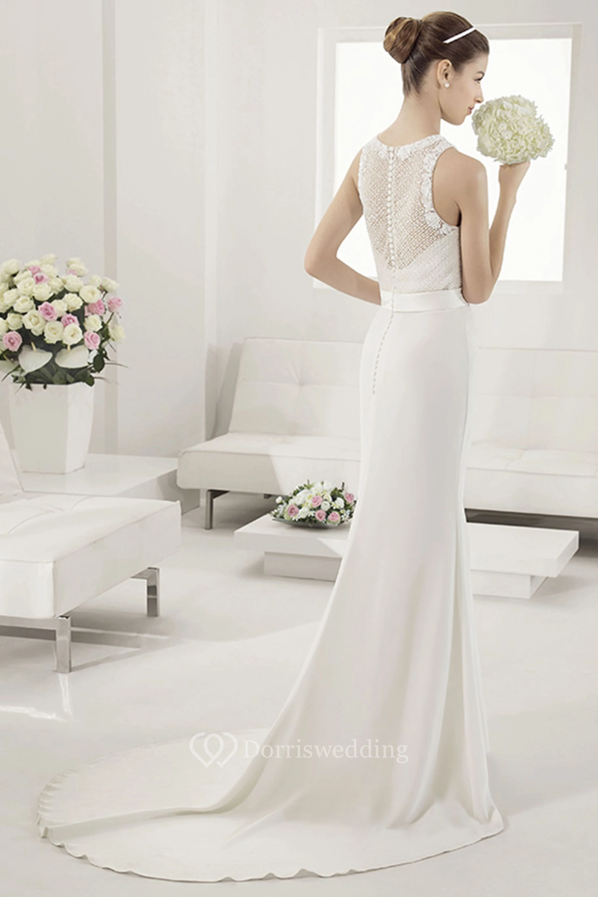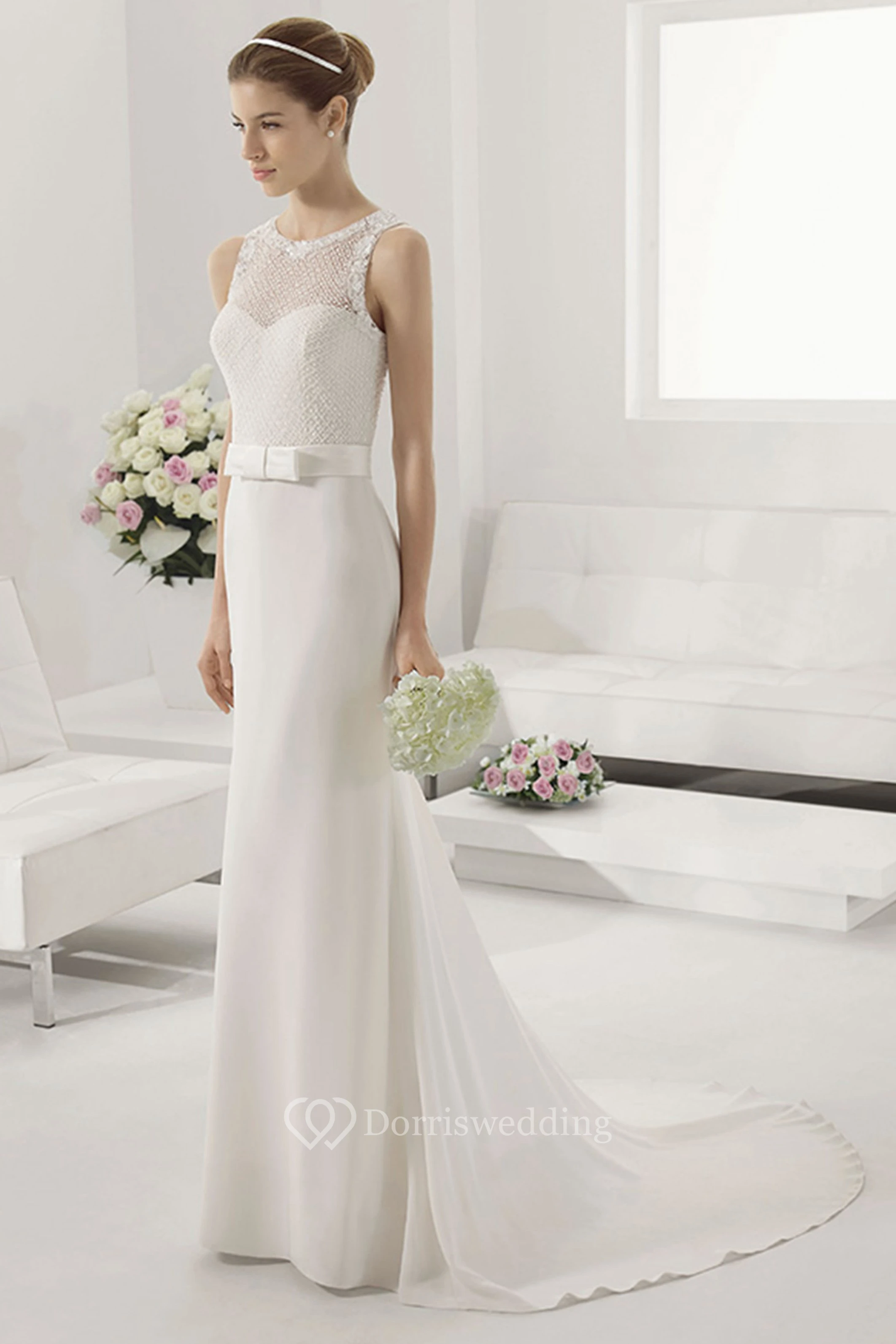 Scoop Neck Sleeveless Sheath Long Wedding Dress With Belt And Pearl Net Bodice