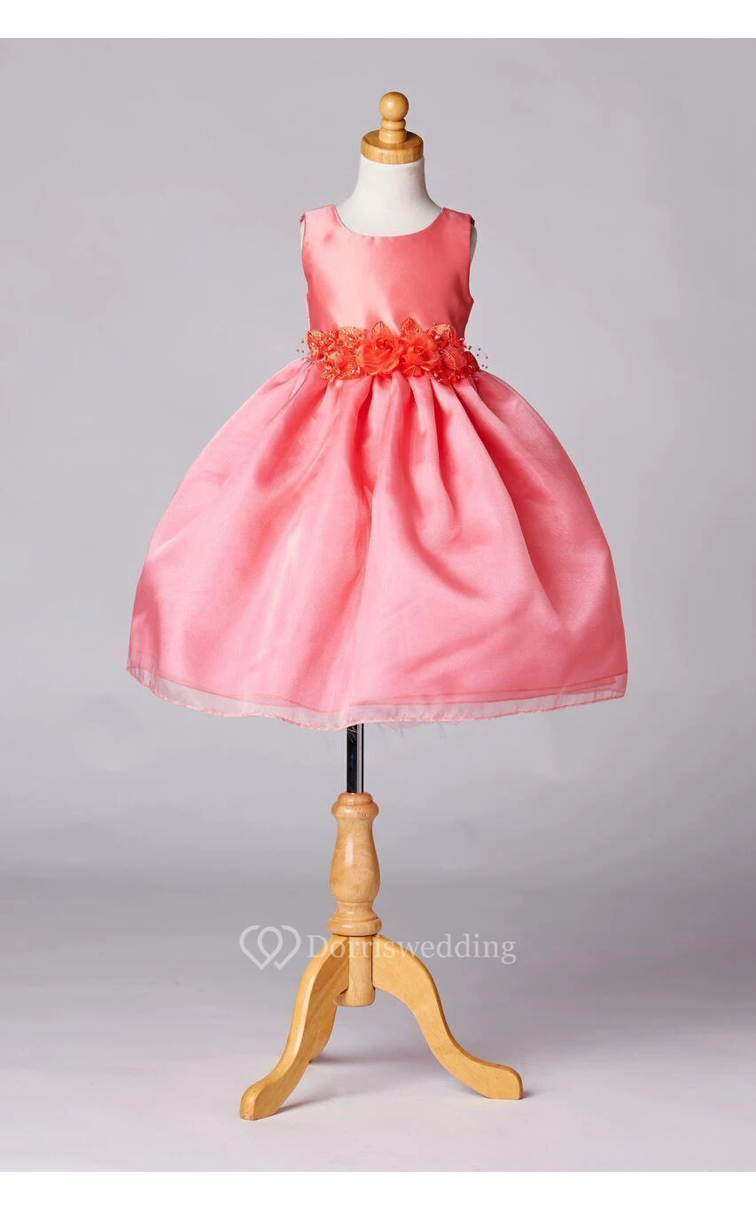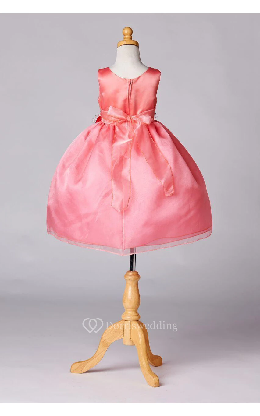 Scoop Neck Sleeveless Tea Length Pleated Organza Dress With Flower Sash
