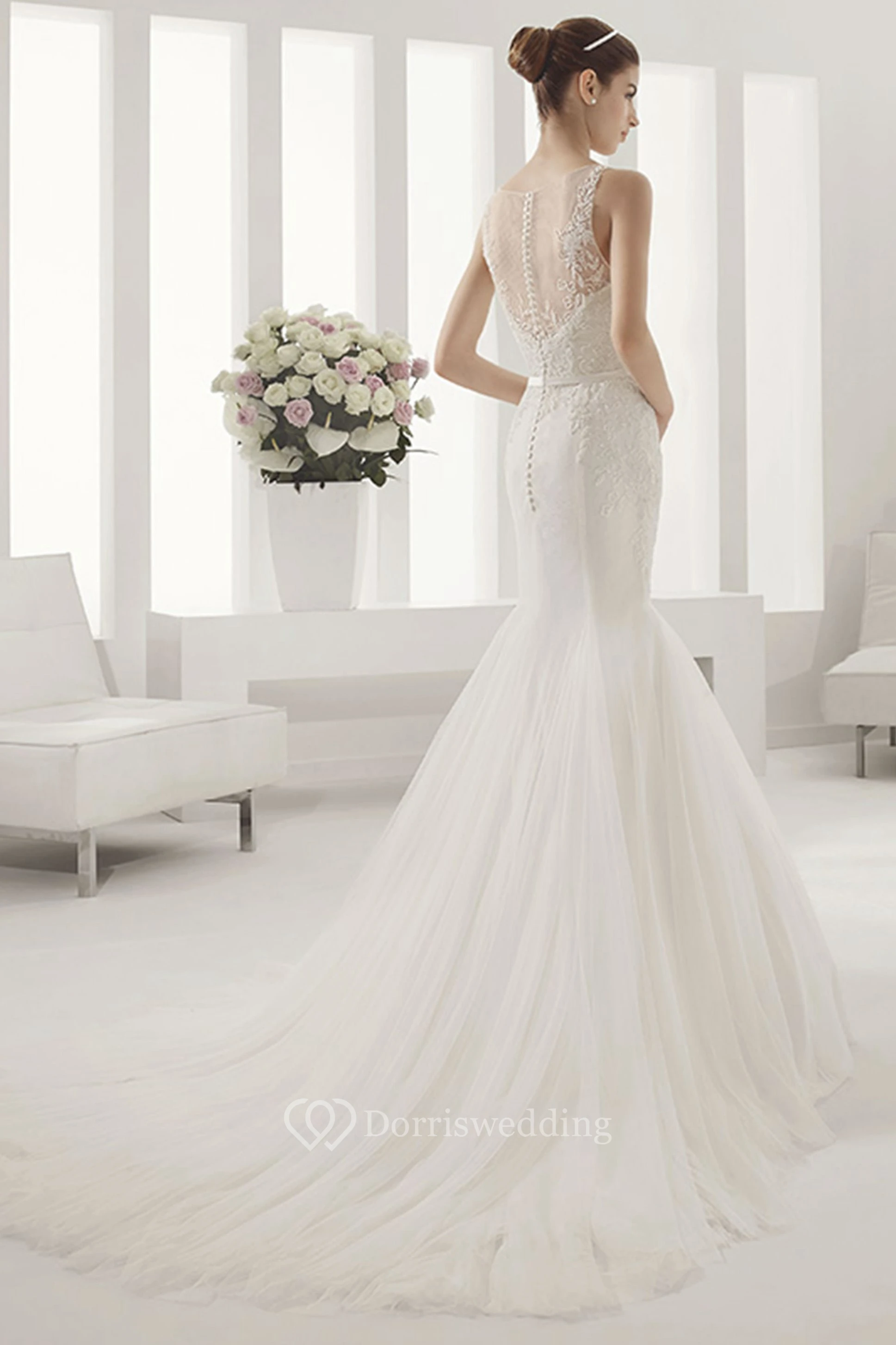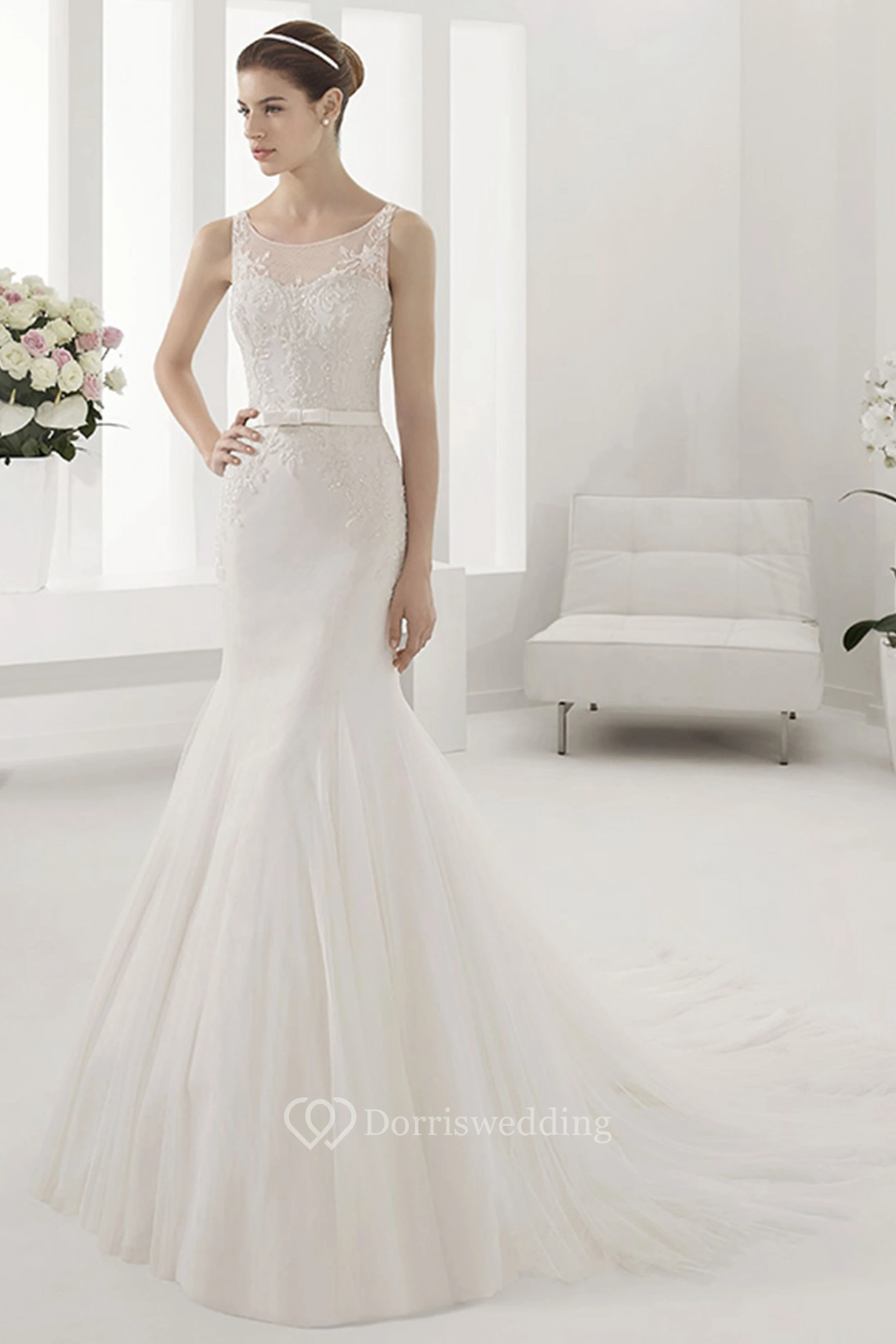 Scoop Neckline Mermaid Gown With Belt And Appliqued Bodice