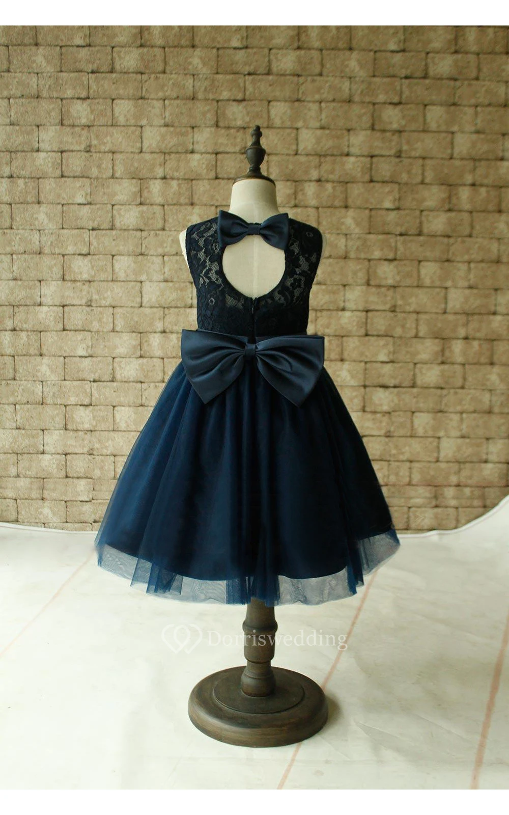 Scoop Neckline Sleeveless Lace Bodice Tulle Dress With Bow and Keyhole