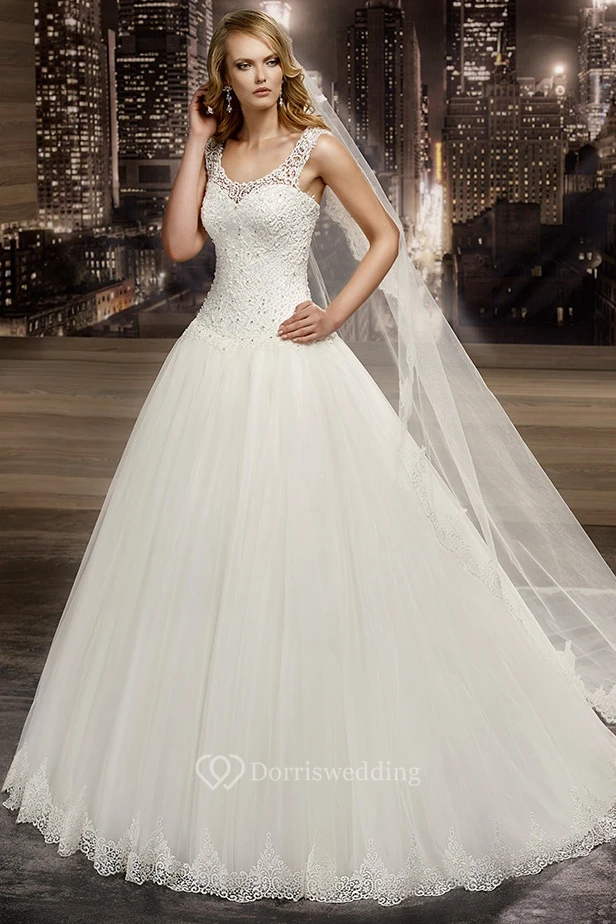 Scooped-Neck Cap Sleeve A-Line Bridal Gown With Illusive Neckline And Beaded Bodice