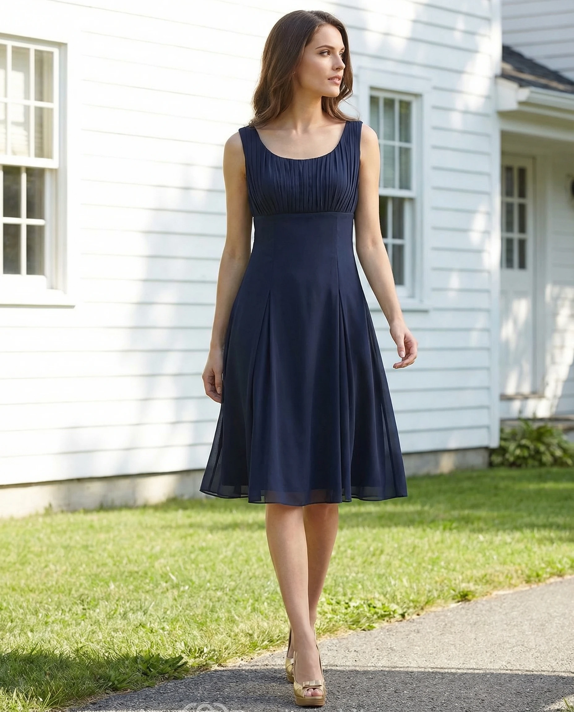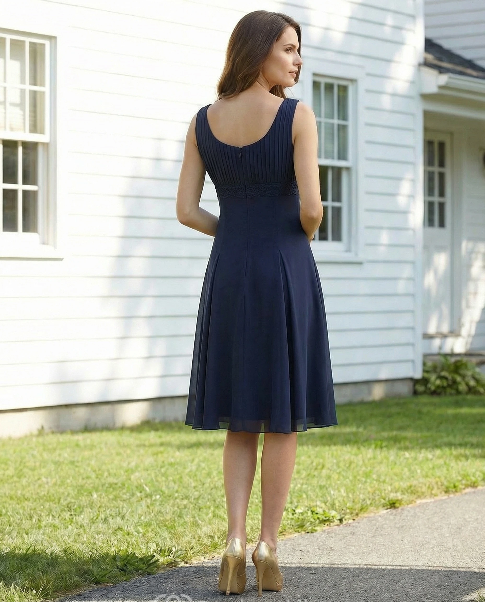 Scooped Pleated Chiffon Knee-Length Dress