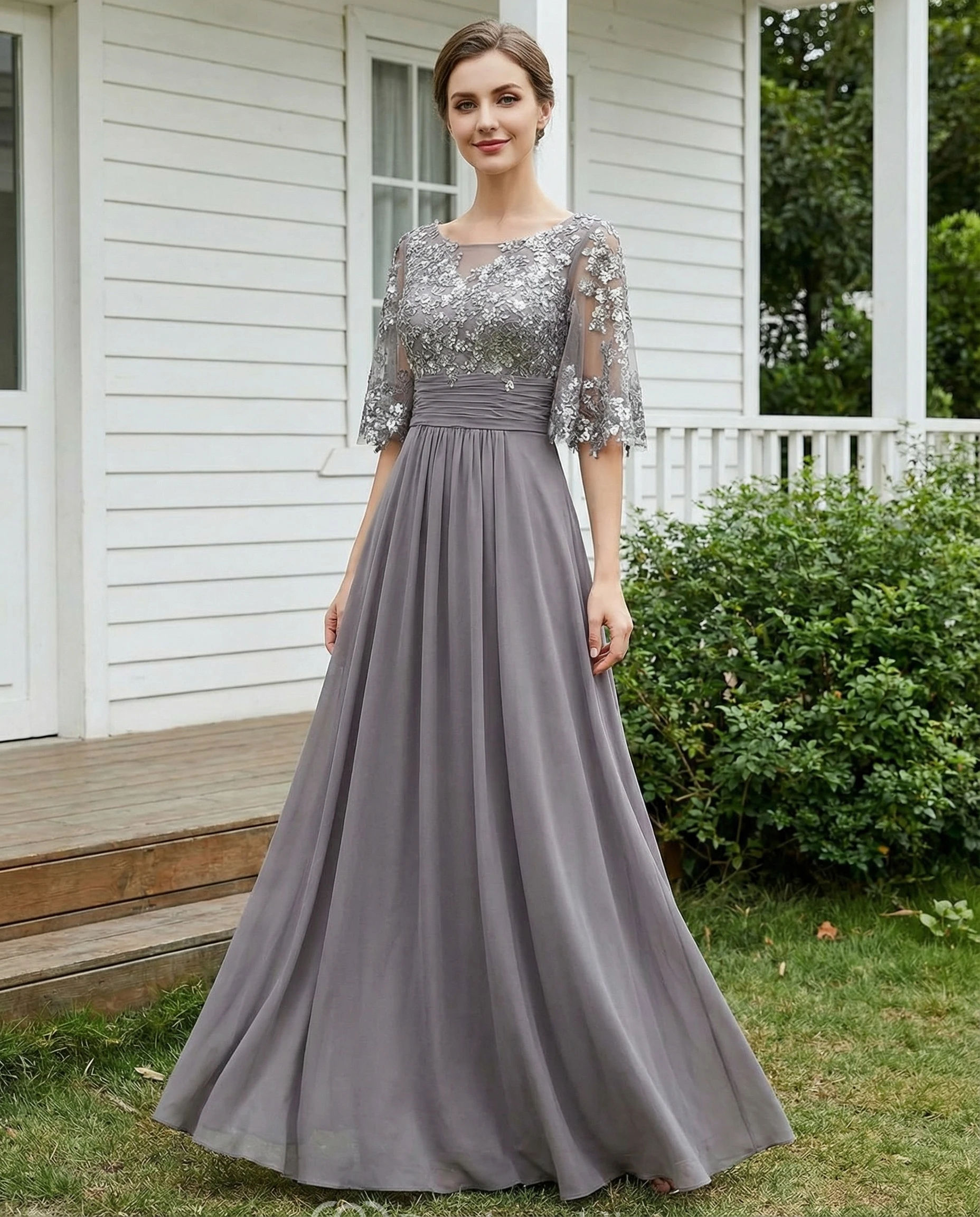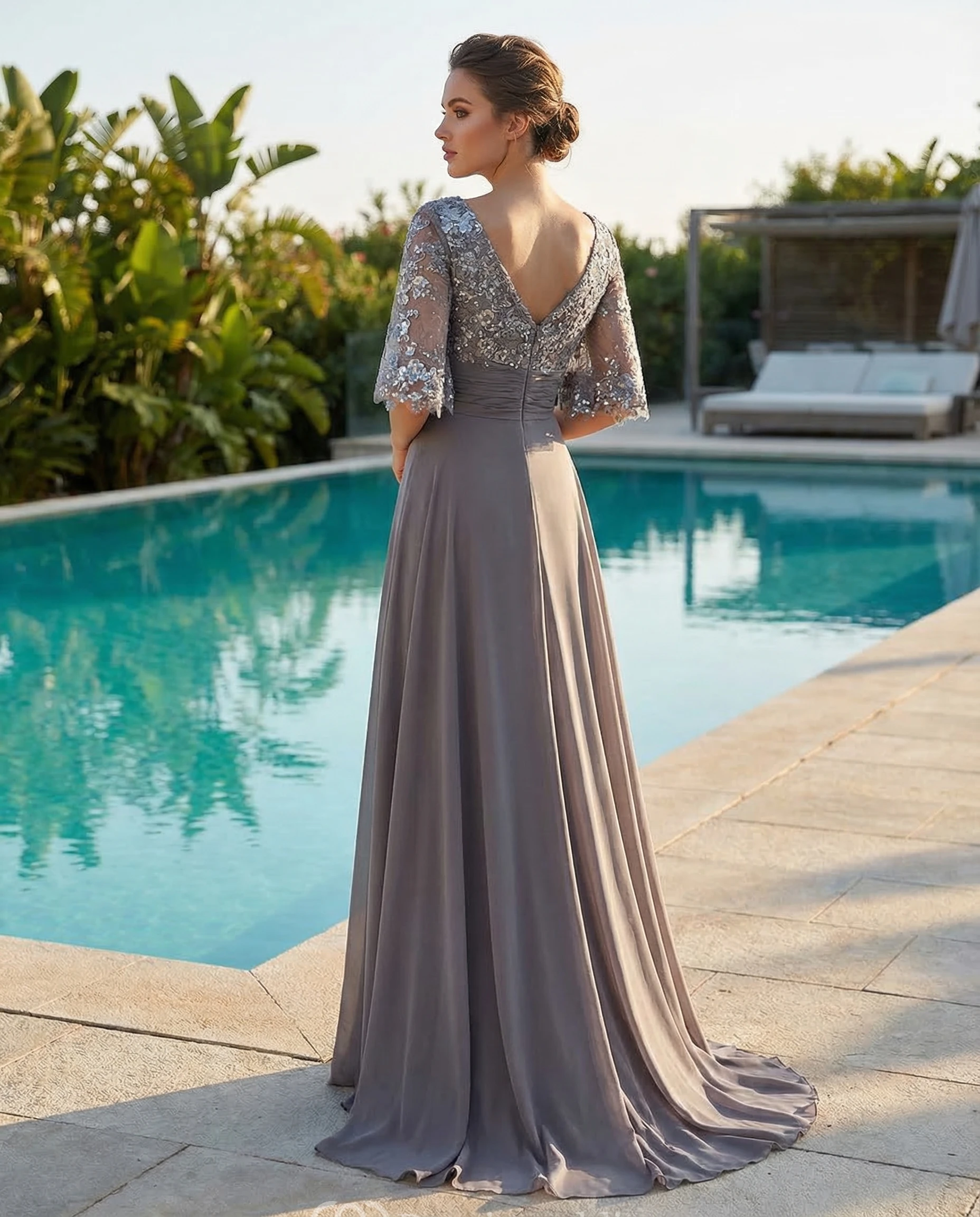 Sequin Chiffon A-Line Gown with Half Sleeves