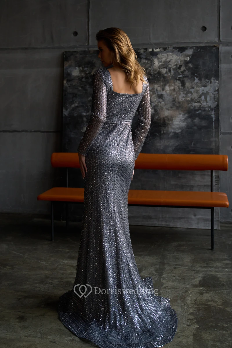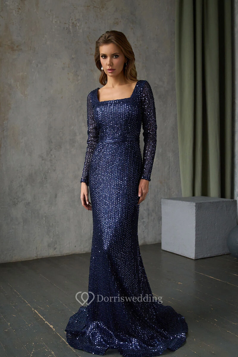Sequin Square-neck Long Sleeve Sheath Beaded Evening Dress