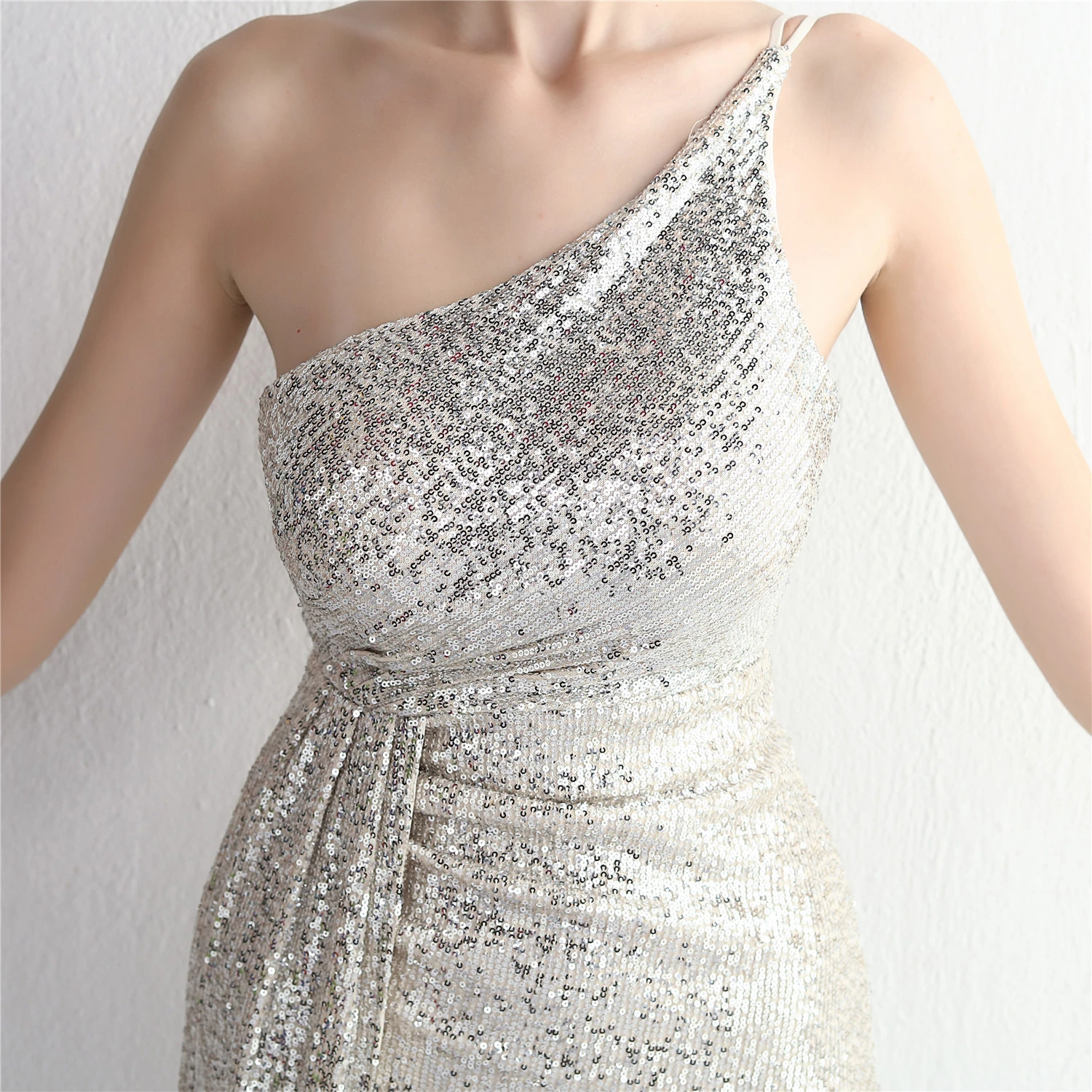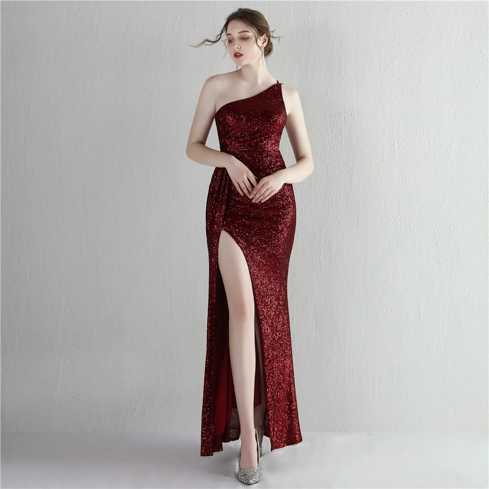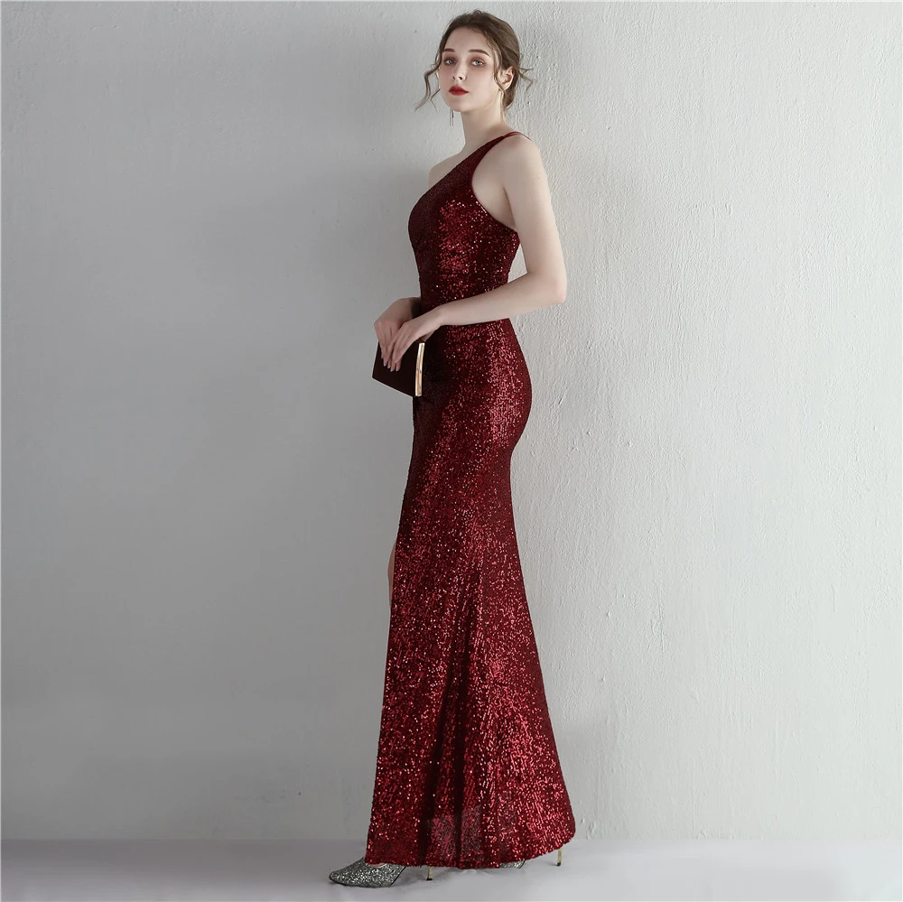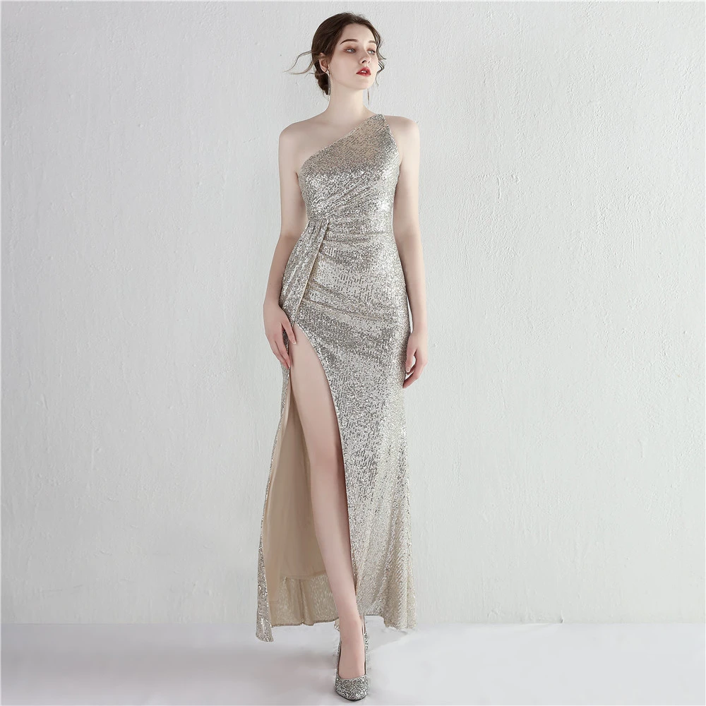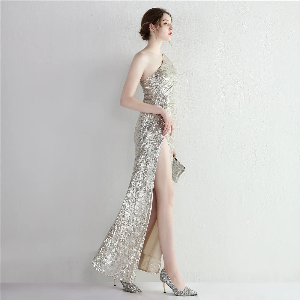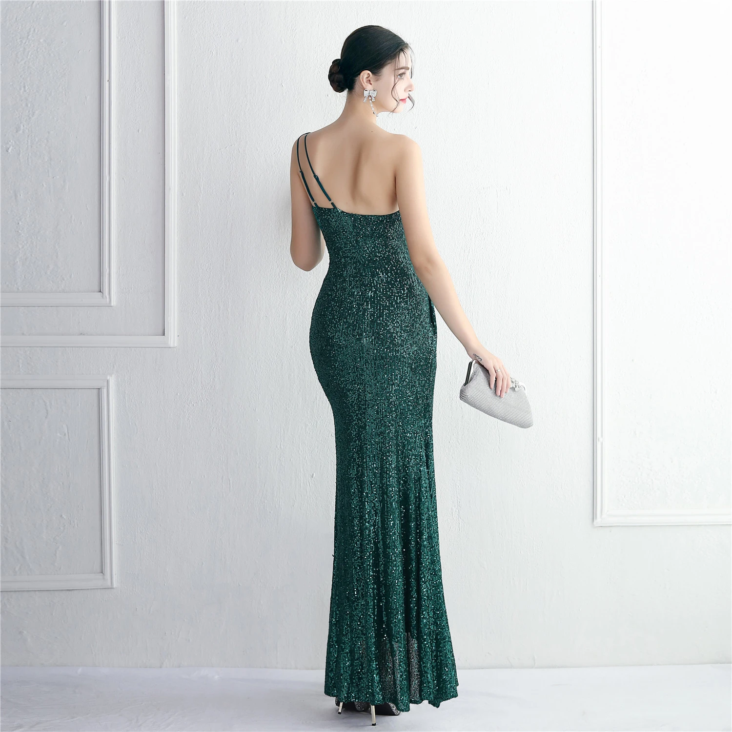 Sequined One-Shoulder Celebrity Cold Banquet Slit Long Sequin Aura Queen Dinner Fishtail Dress