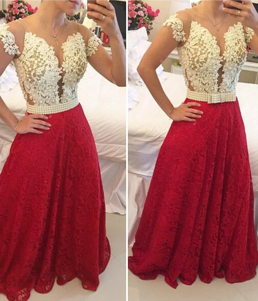 Sexy A-line Lace Appliques Prom Dress Pearls Cap Sleeve