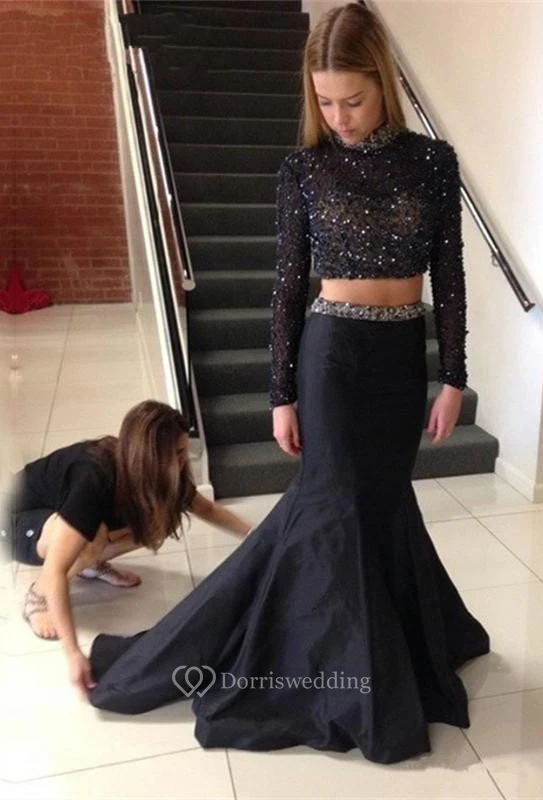 Sexy Beadings Black Two Piece Evening Dress Long Sleeve Mermaid High Neck